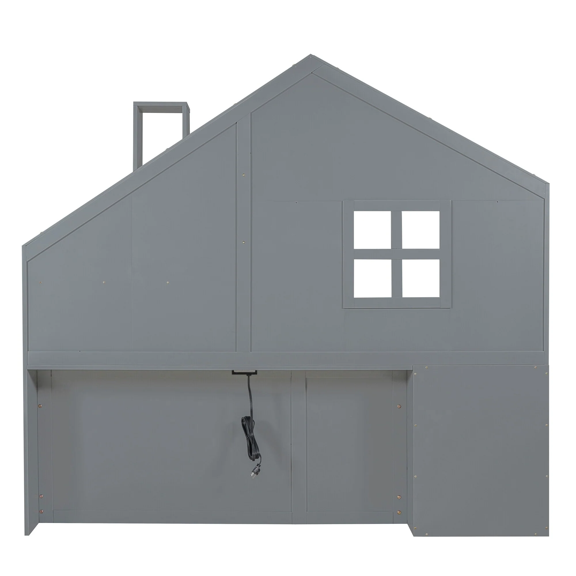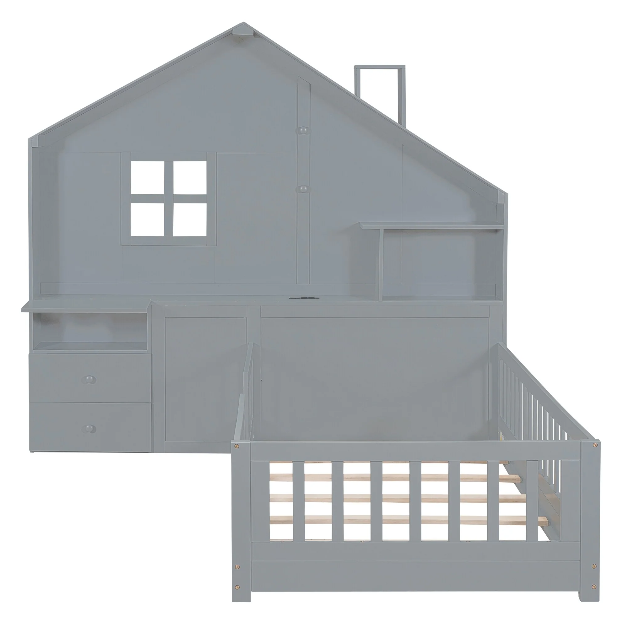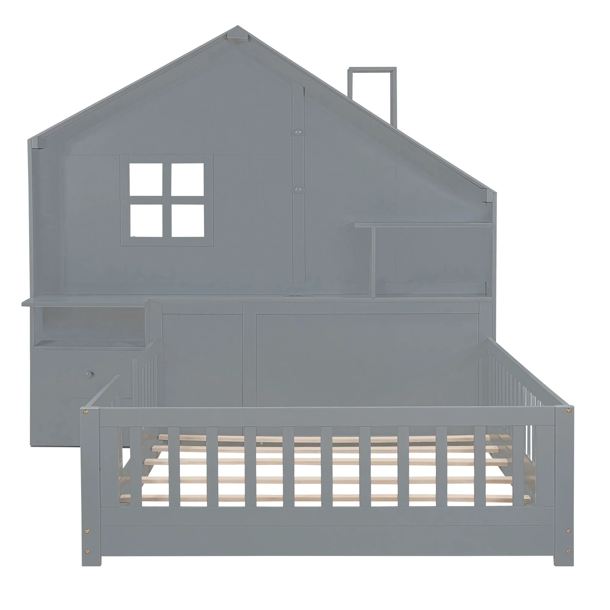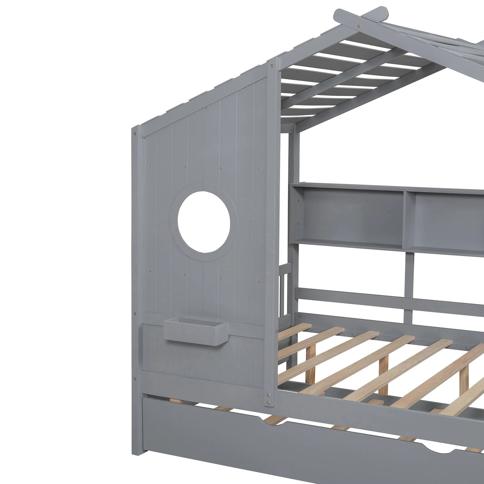 Gray Twin Platform Bed with Two Beds, Roof, and Window Design