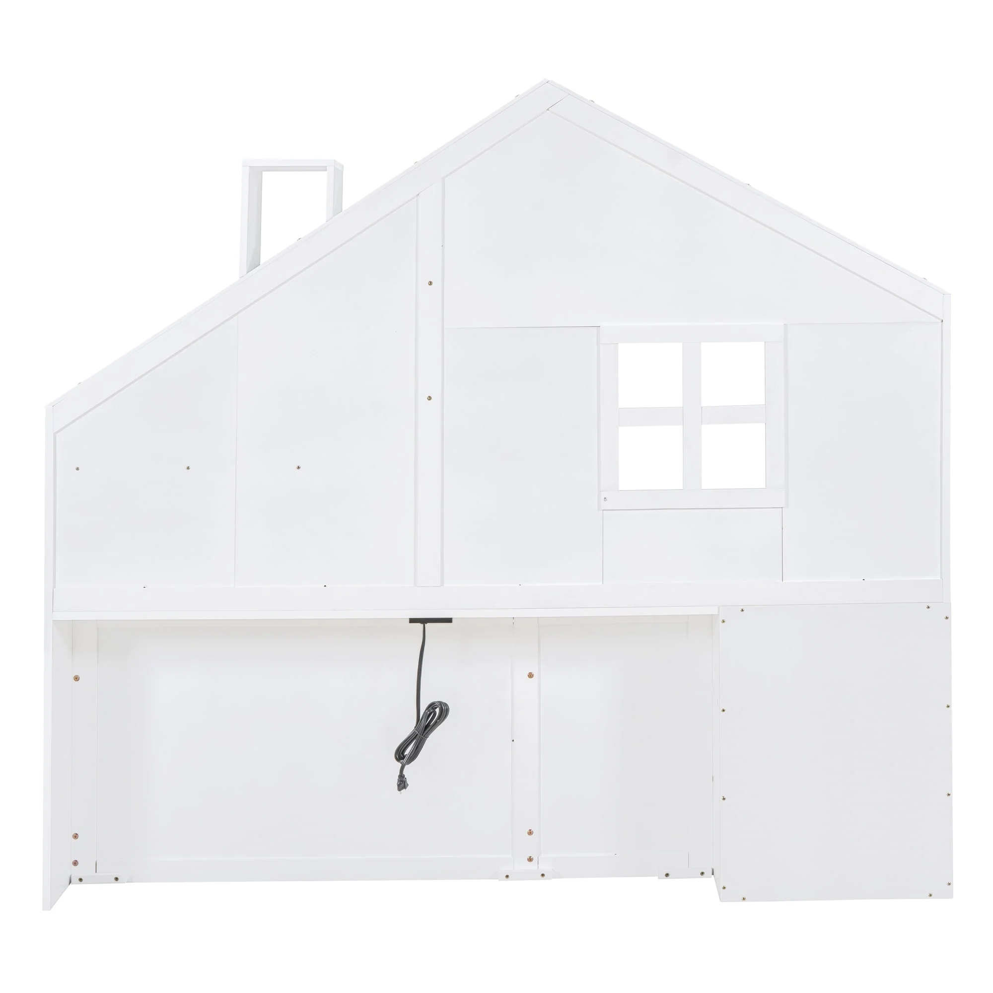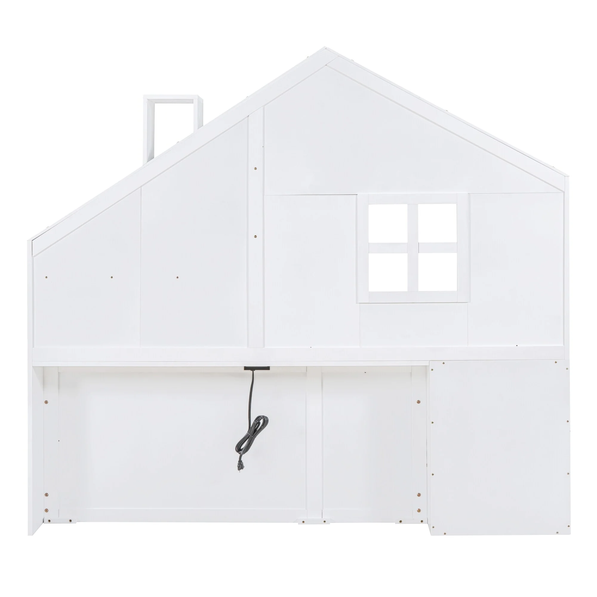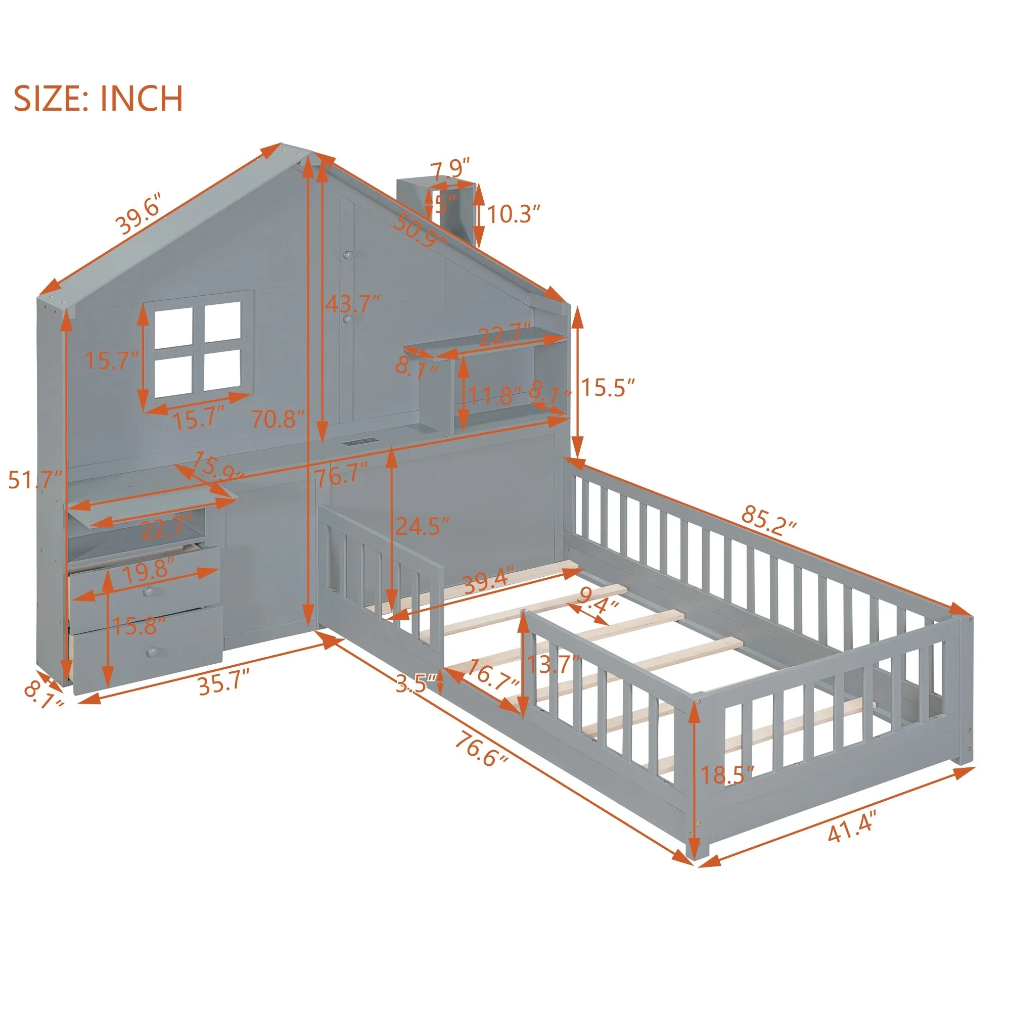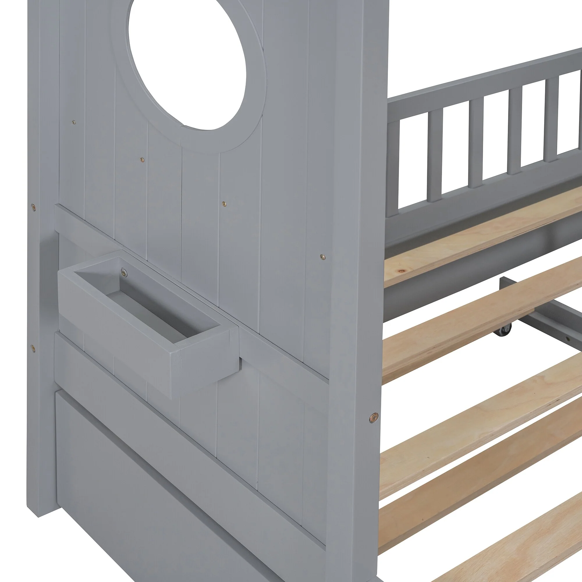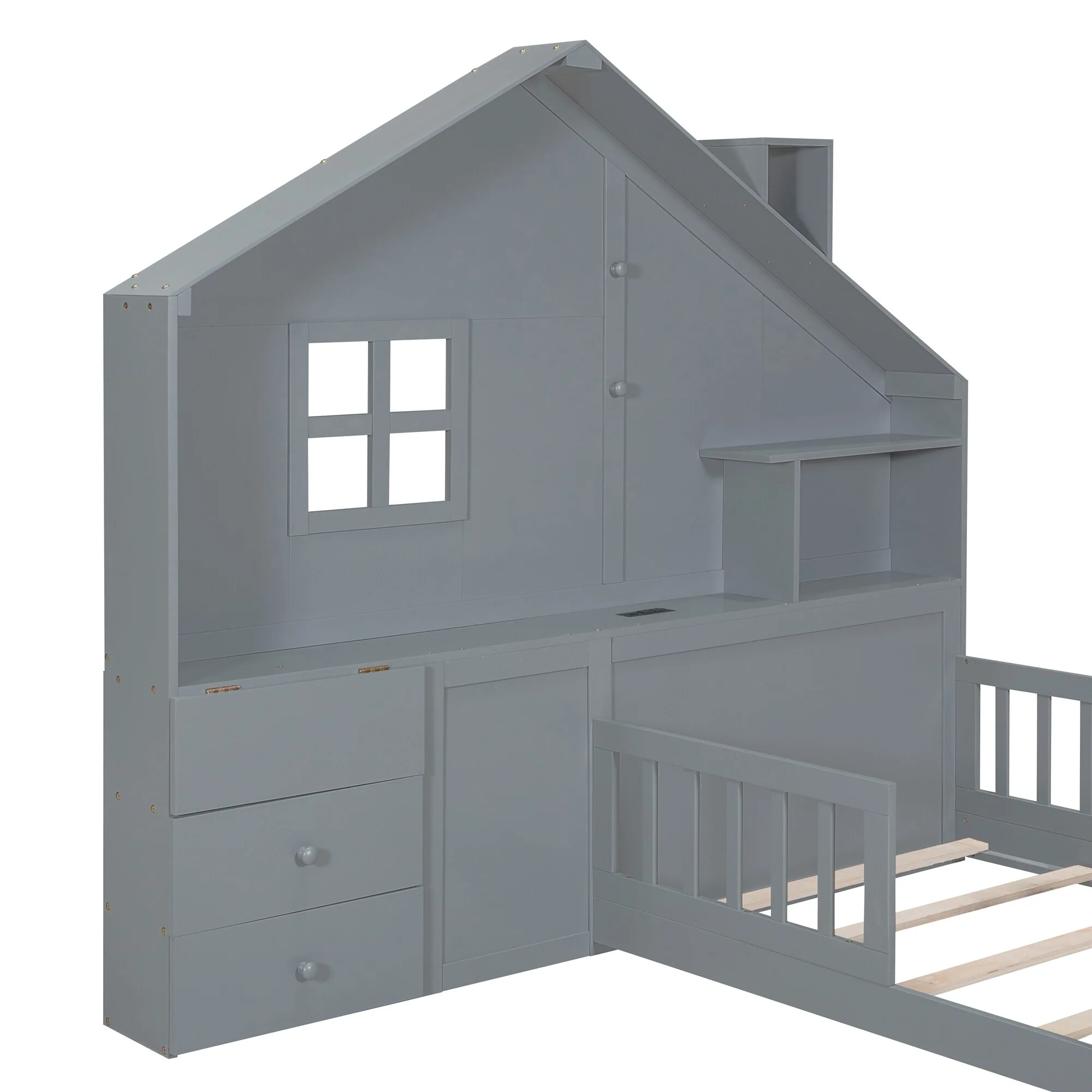 Gray Twin Platform Bed with Two Beds, Roof, and Window Design