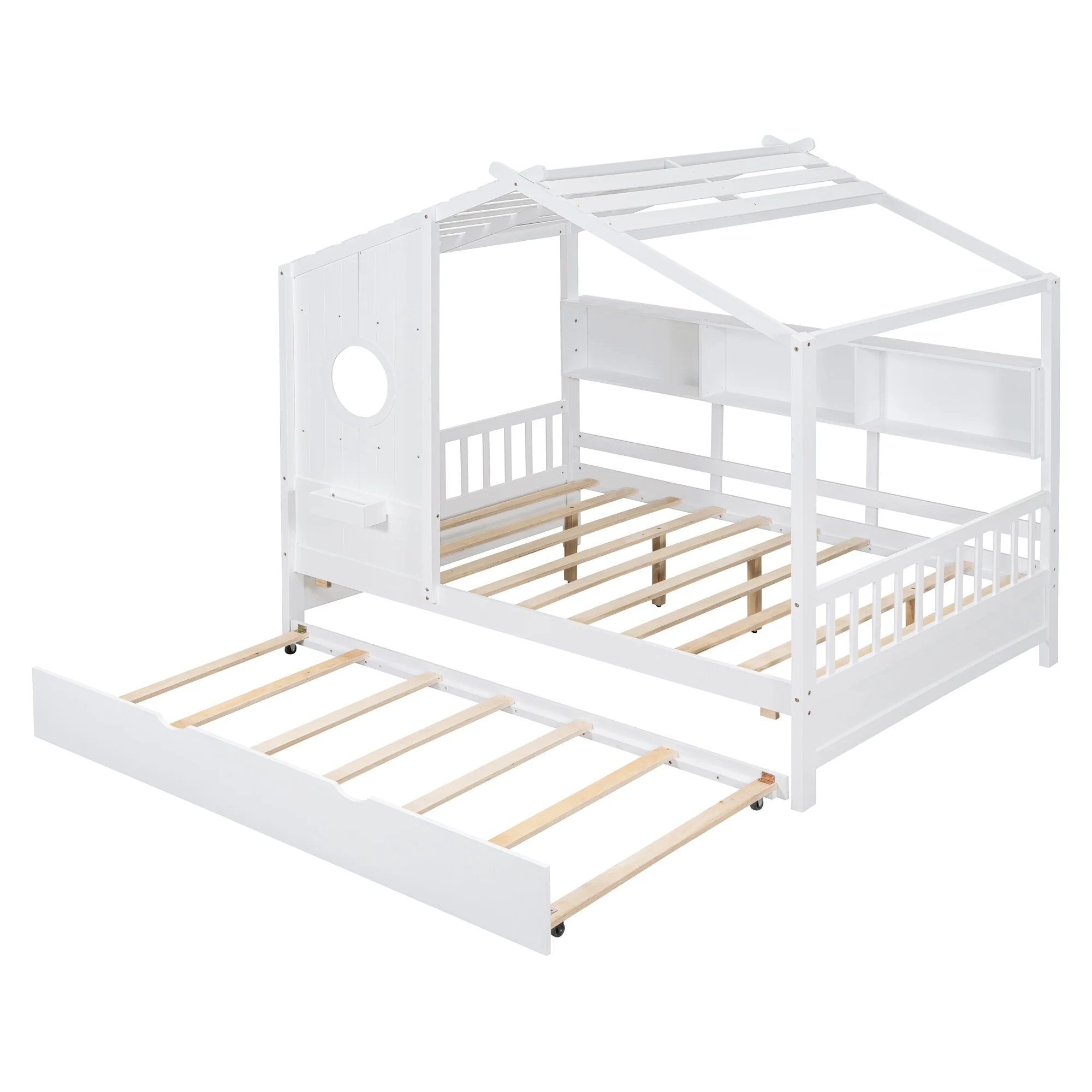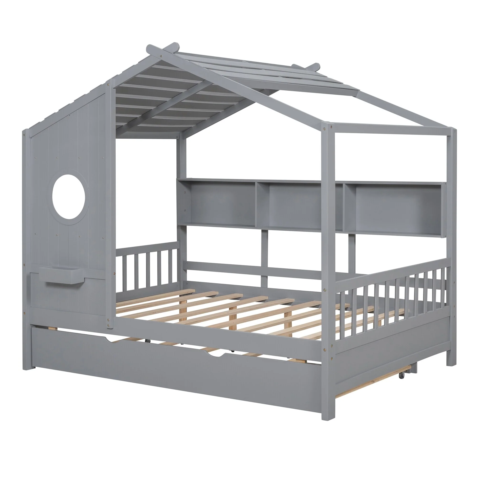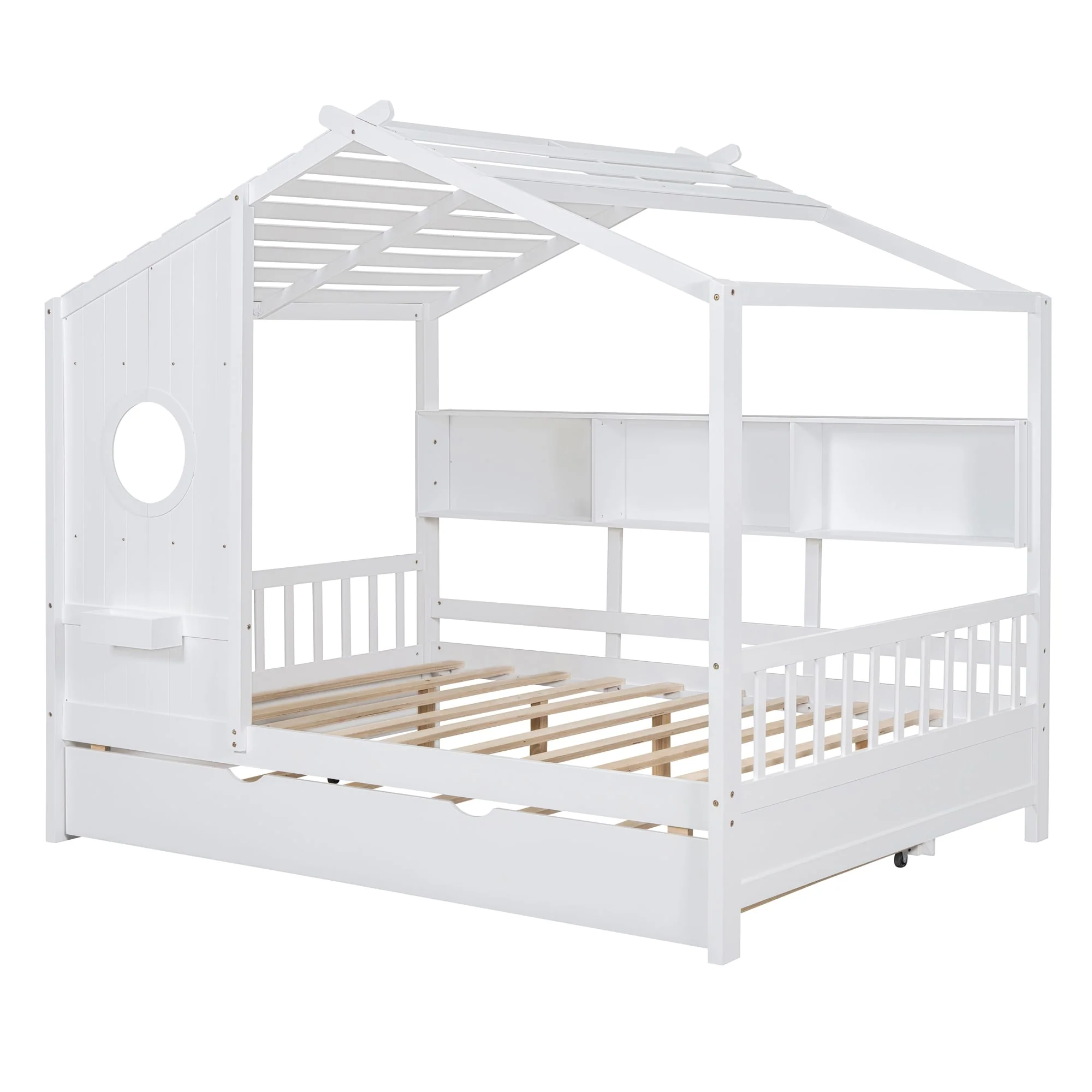 Full Size House Bed with Trundle and Storage Shelves, Modern Kids Design