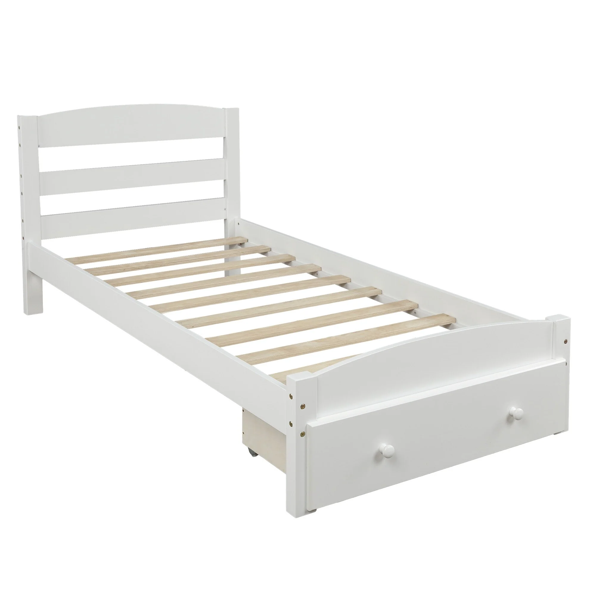 Classic Twin Platform Bed with Built-in Storage Drawer and Solid Wood Slats