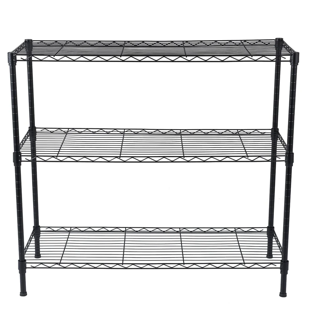 This durable shelf unit is constructed of heavy duty steel and ?features three adjustable shelves that can hold up to 350 pounds of ?evenly distributed weight. It includes adjustable leveling feet for ?customization and stability on any floor surface. You can assemble this ?unit in minutes without tools required. Easy to clean, just wipe with a ?damp cloth and towel dry.