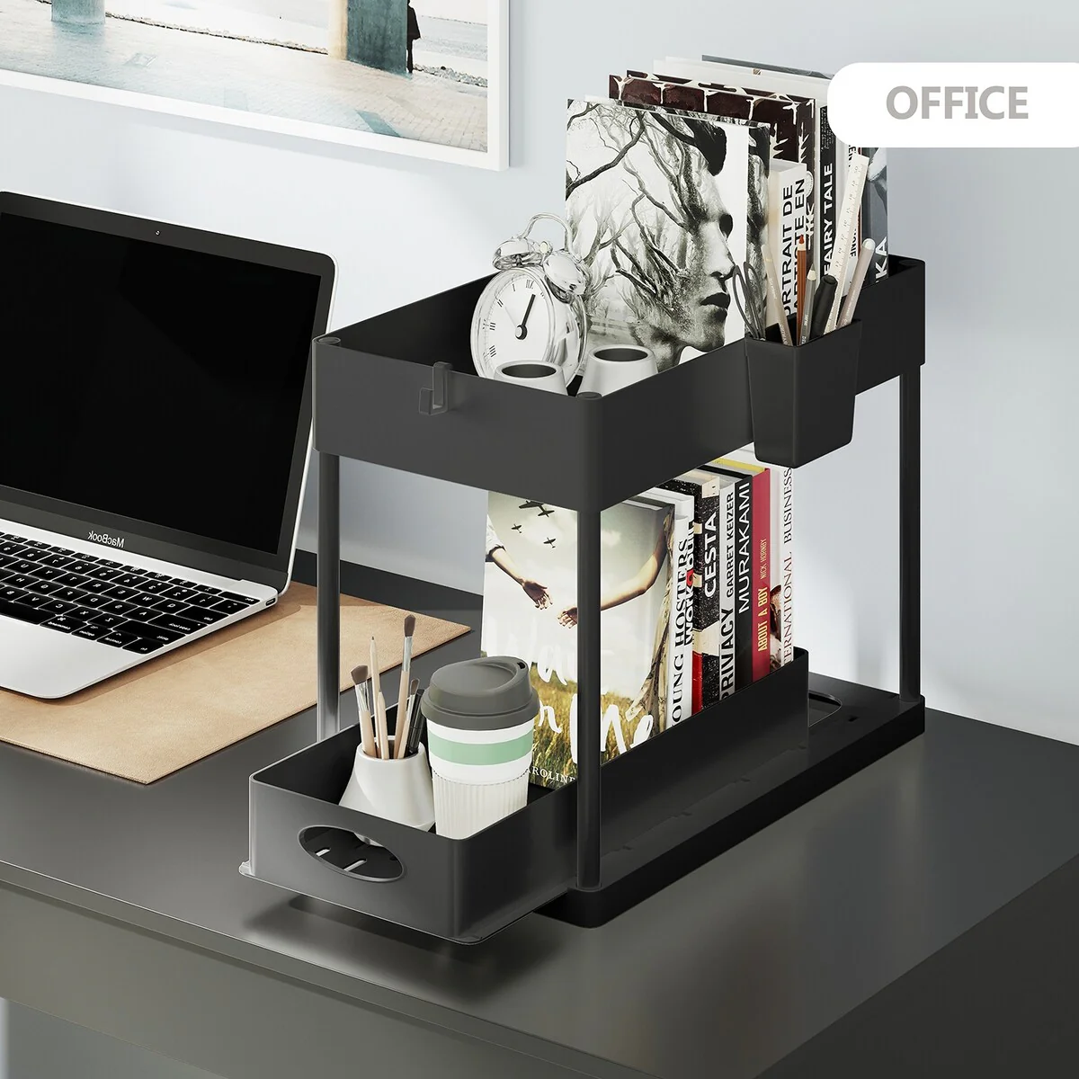 StorageBud 2 Tier Under Kitchen Sink Organizer with Sliding Drawer-Bathroom Cabinet Organizer with Utility Hooks and Side Caddy