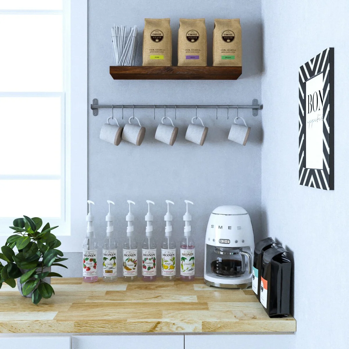 Moasis Farmhouse Coffee Bar Cabinet with Sliding Barn Door and Wine Glass Holder