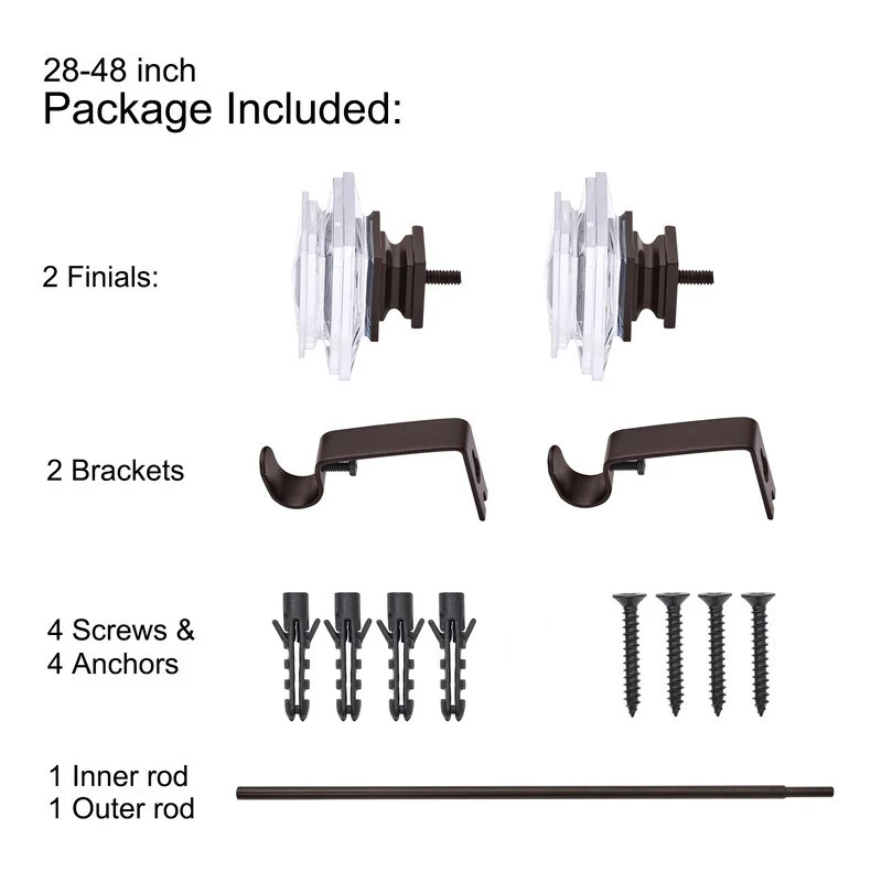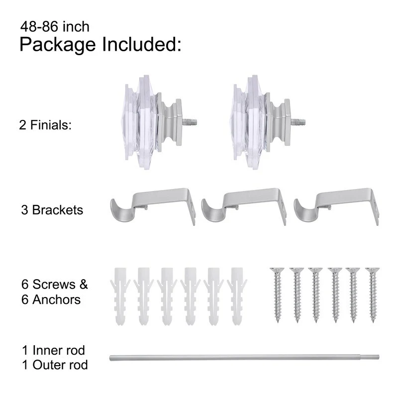 UTOPIA ALLEY 3/4 Inch Curtain Rods are great for any room in the house. Add a touch of elegance to your home with our decorative Nickel curtain rods. The diameter of the all-metal rod is 3/4 inches and easily adjusts telescopically to fit windows. The rod length adjusts from 28"-48", 48"-86" and 86"-120", so you can use them in any size window. This curtain rod is easy to install and comes with all the necessary hardware to mount it to your wall. This curtain rod kit includes everything you need to hang your curtains.WHAT'S INCLUDED:28"-48" comes with 2 finials, 2 brackets, 1 inner rod, 1 outer rod, 4 screws, and 4 anchors.48"-86" comes with 2 finials, 3 brackets, 1 inner rod, 1 outer rod, 6 screws, and 6 anchors.86"-120" comes with 2 finials, 3 brackets, 1 inner rod, 2 outer rods, 6 screws, and 6 anchors.All you'll need from your end is a screwdriver and drill. These window rods for curtains provide a stylish backdrop for your drapes, which will help set the tone for your decorating scheme.COLOR OPTIONS: Matt black, Nickel and Bronze.COMPLEMENTS ANY CURTAIN: Add a touch of elegance to your home with our decorative Nickel curtain rods. These drapery rods are great for any room in the house, and they especially shine in the bedroom, living room, or dining area. These window rods for curtains provide a stylish backdrop for your drapes, which will help set the tone for your decorating scheme.ADJUSTABLE CURTAIN ROD: These adjustable curtain rods work great for any window! The diameter of the all-metal rod is 3/4 inches and easily adjusts telescopically to fit windows. The rod length adjusts from 28"-48", 48"-86" and 86"-120", so you can use them in any window size. These drapery rods come beautifully finished in a nickel/black/bronze tone for a sleek, modern look.EASY-TO-INSTALL: This curtain rod is easy to install and comes with all the necessary hardware to mount it to your wall. All you'll need from your end is a screwdriver and drill. Our window curtain rods are made from durable metal with a finish that makes it easy to match your decor.ABOUT US: UTOPIA ALLEY is a woman-owned and operated business. Our goal is to provide our customers with furniture, home decor, essentials, and accessories made with durable products and exceptional craftsmanship. We believe in creating a stylish, comfortable space where you can relax, recharge, and feel inspired.