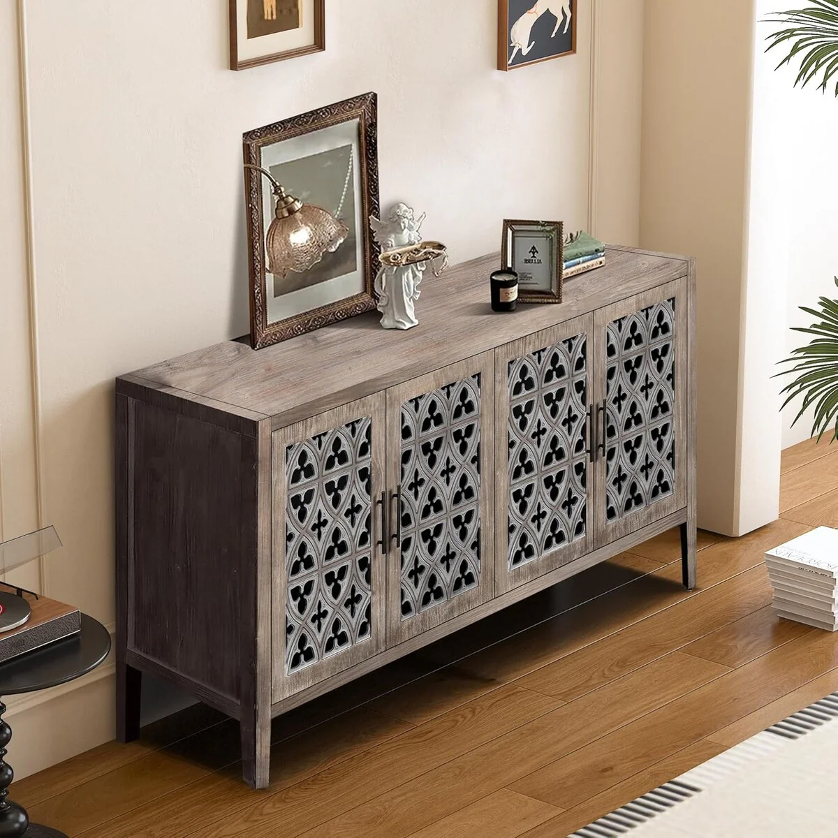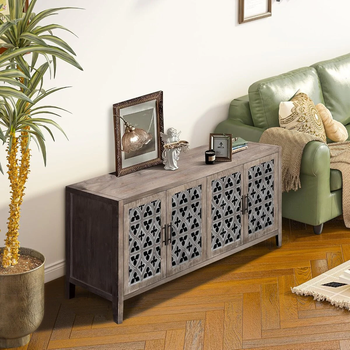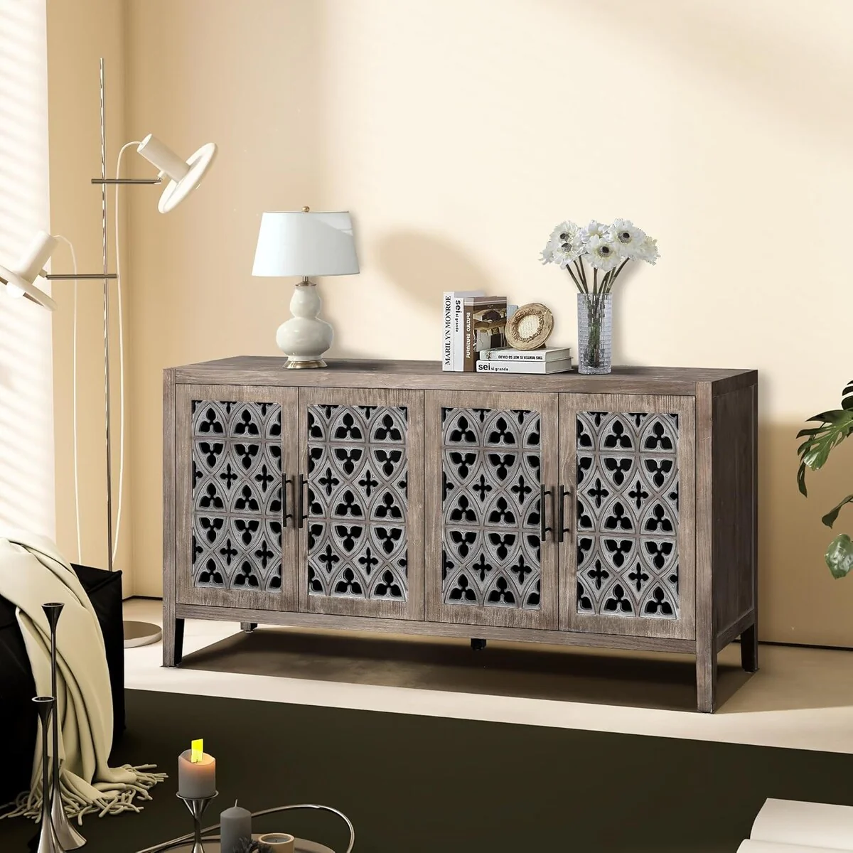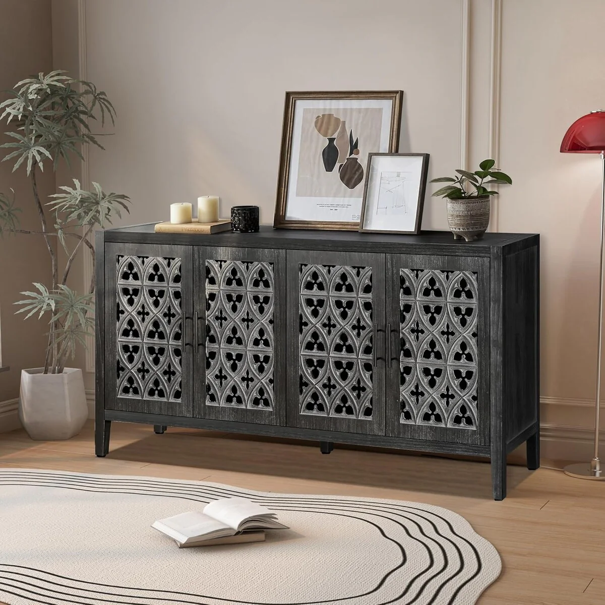 Roomfitters Carved Flower Door Large Storage Cabinet with Metal Handle - Perfect for Living Room, Kitchen, Entryway