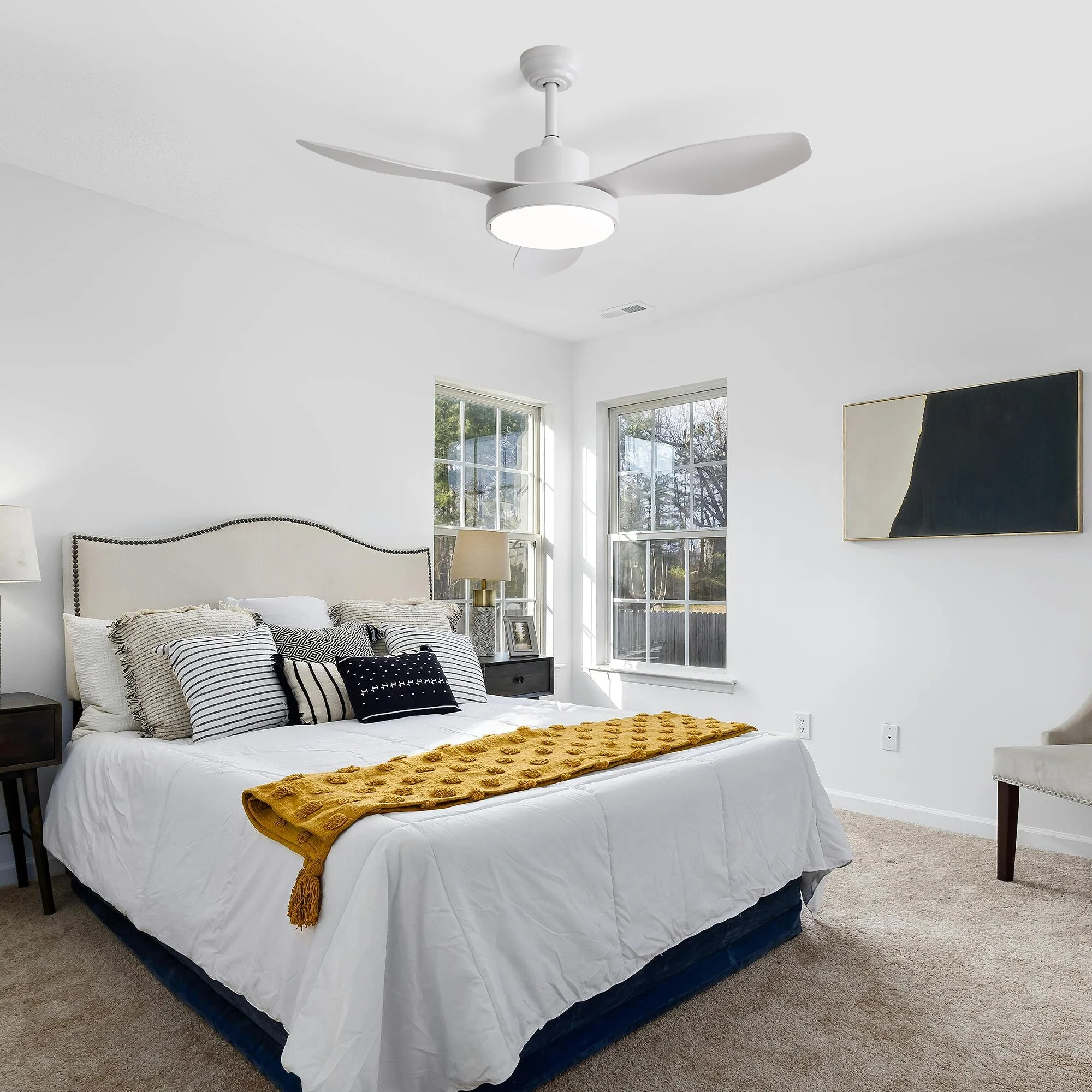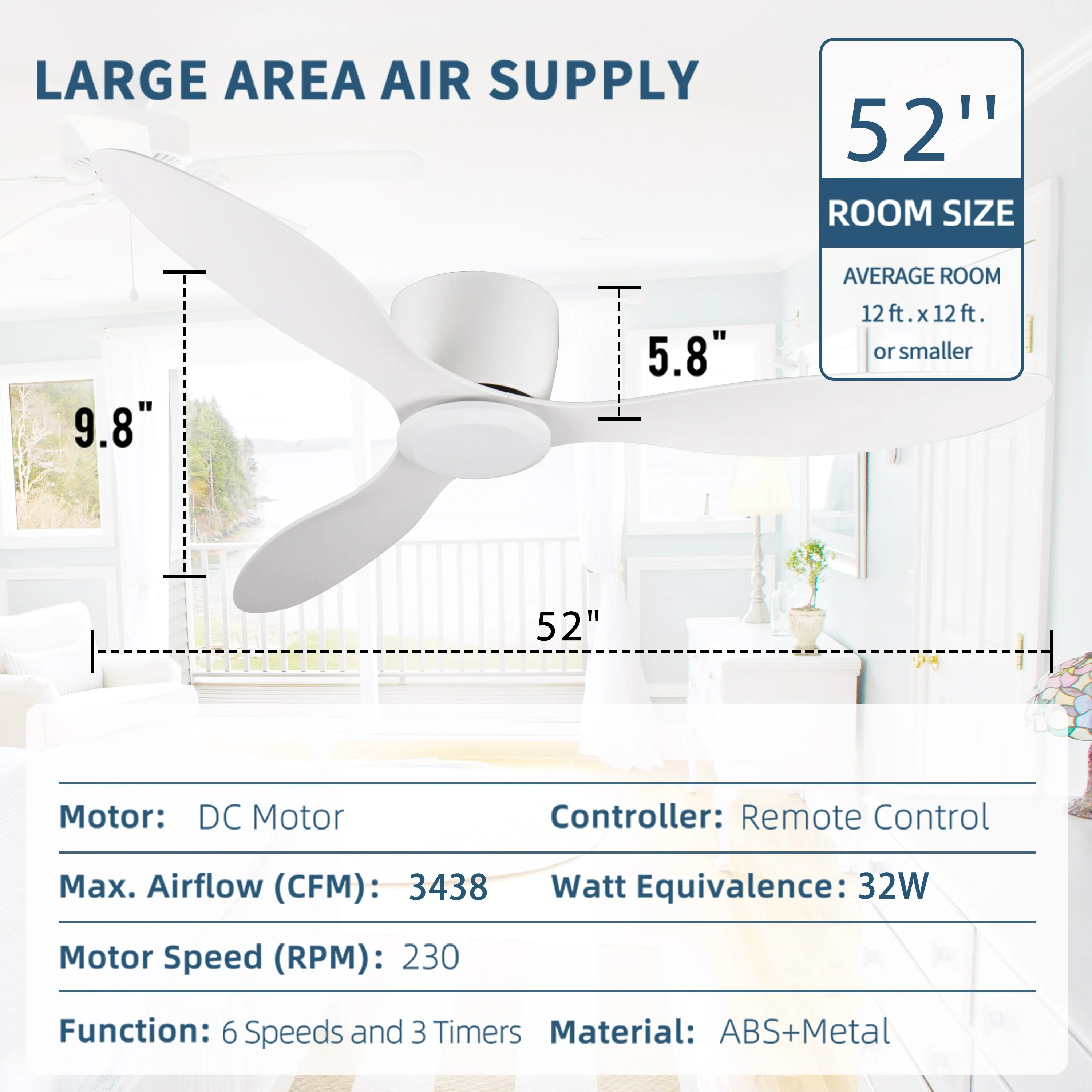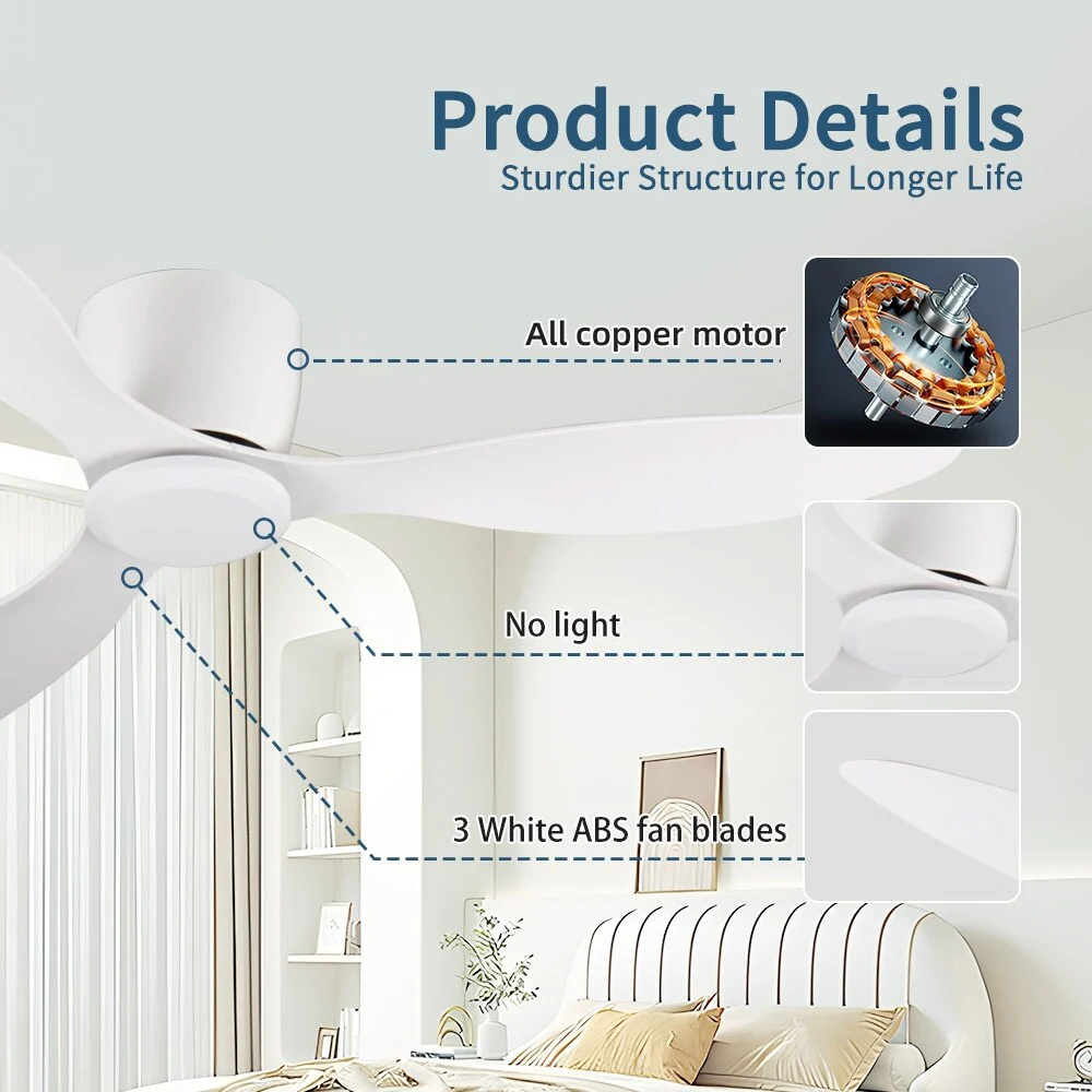 52" Flush Mount 6-Speeds Ceiling Fan Without Light, 3 White Reversible Fan Blades Ceiling Fan for Bedroom Living Room Kitchen