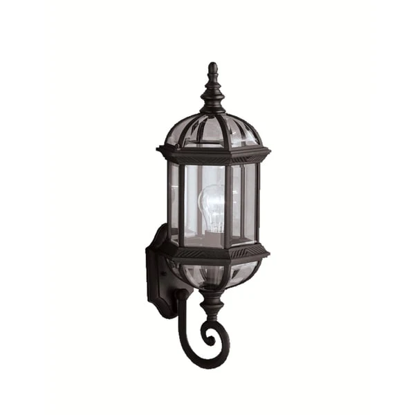 Bring old-world charm to your home with this ornate lantern, constructed from aluminum for lasting style. The detailed fixture features a scrolled accent and a textured black finish for depth. Beveled glass allows the bulb to shine brightly to illuminate your entryway.