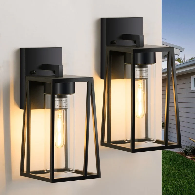 • Enhance your outdoor space with this stylish wall light designed for modern aesthetics and practical functionality. The sleek lantern design, crafted from durable die-cast aluminum with a black finish and clear glass shade, adds a touch of elegance while ensuring robust weather resistance. Built to withstand the elements, this lamp is waterproof and rust-proof, making it ideal for year-round use. With easy installation and all necessary hardware included, you can transform your patios, gardens, and entryways in less than 30 minutes.