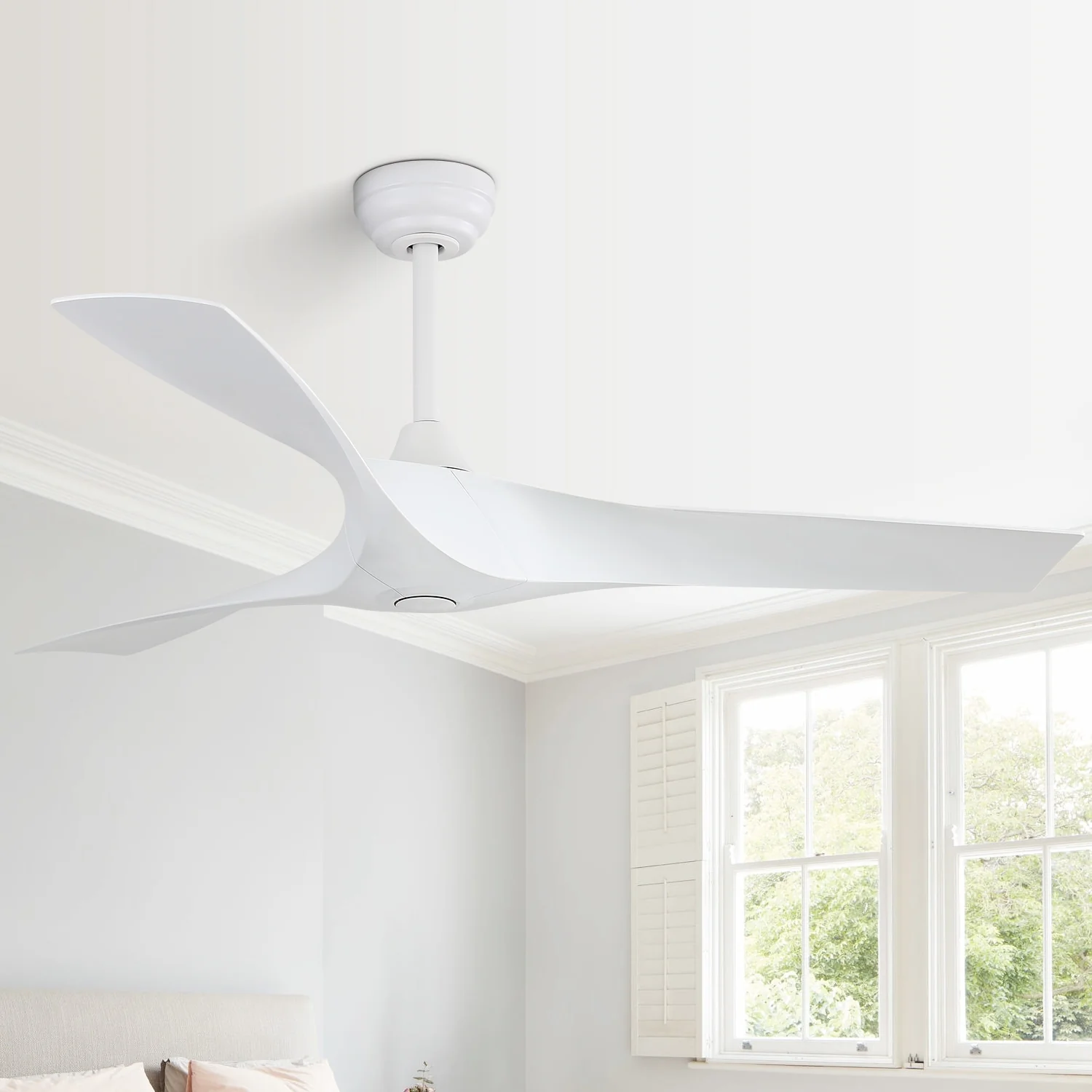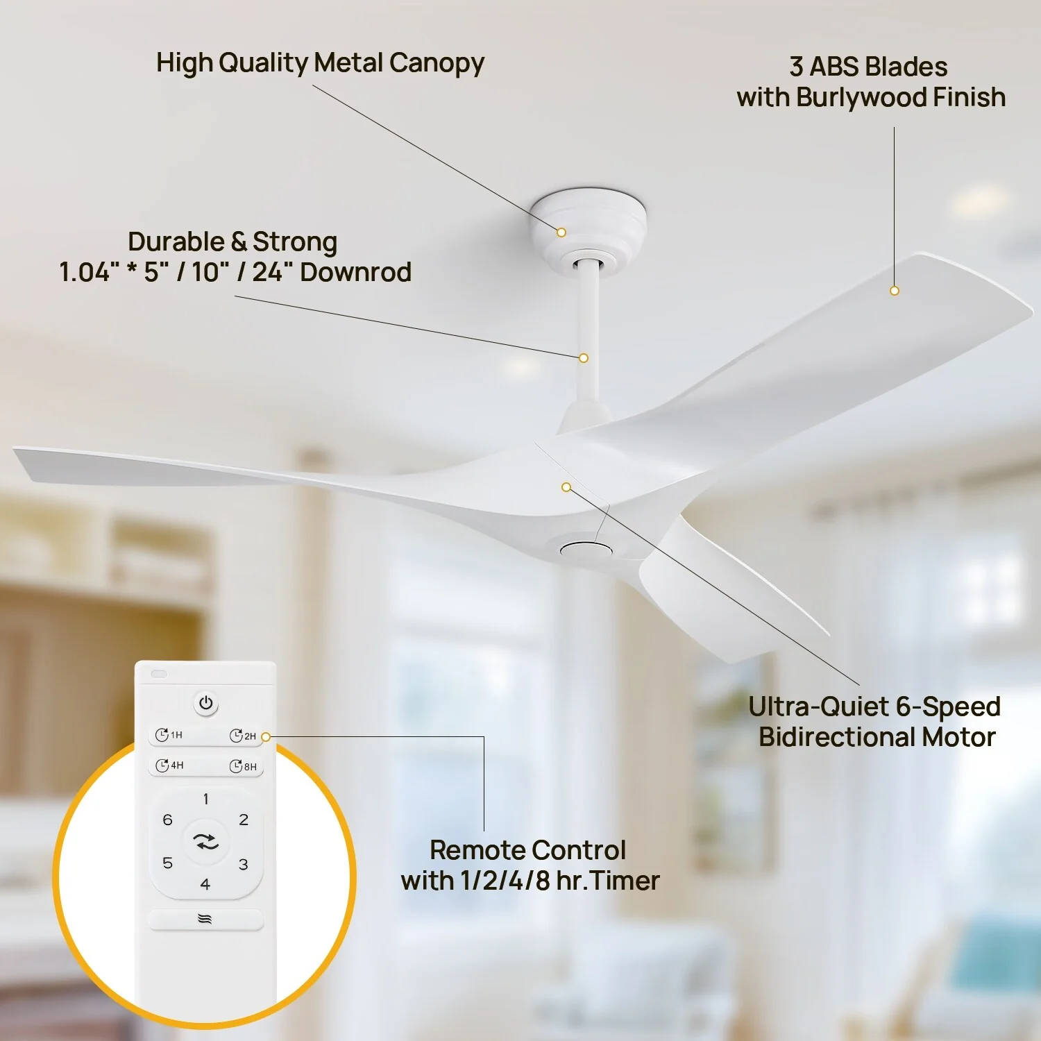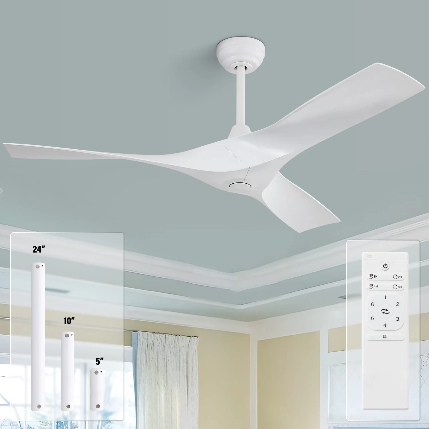 52 Inch White Ceiling Fan No Light, 3 Blade Propeller Ceiling Fan with Remote Control, 6 Speed Quiet Reversible DC Motor Fan
