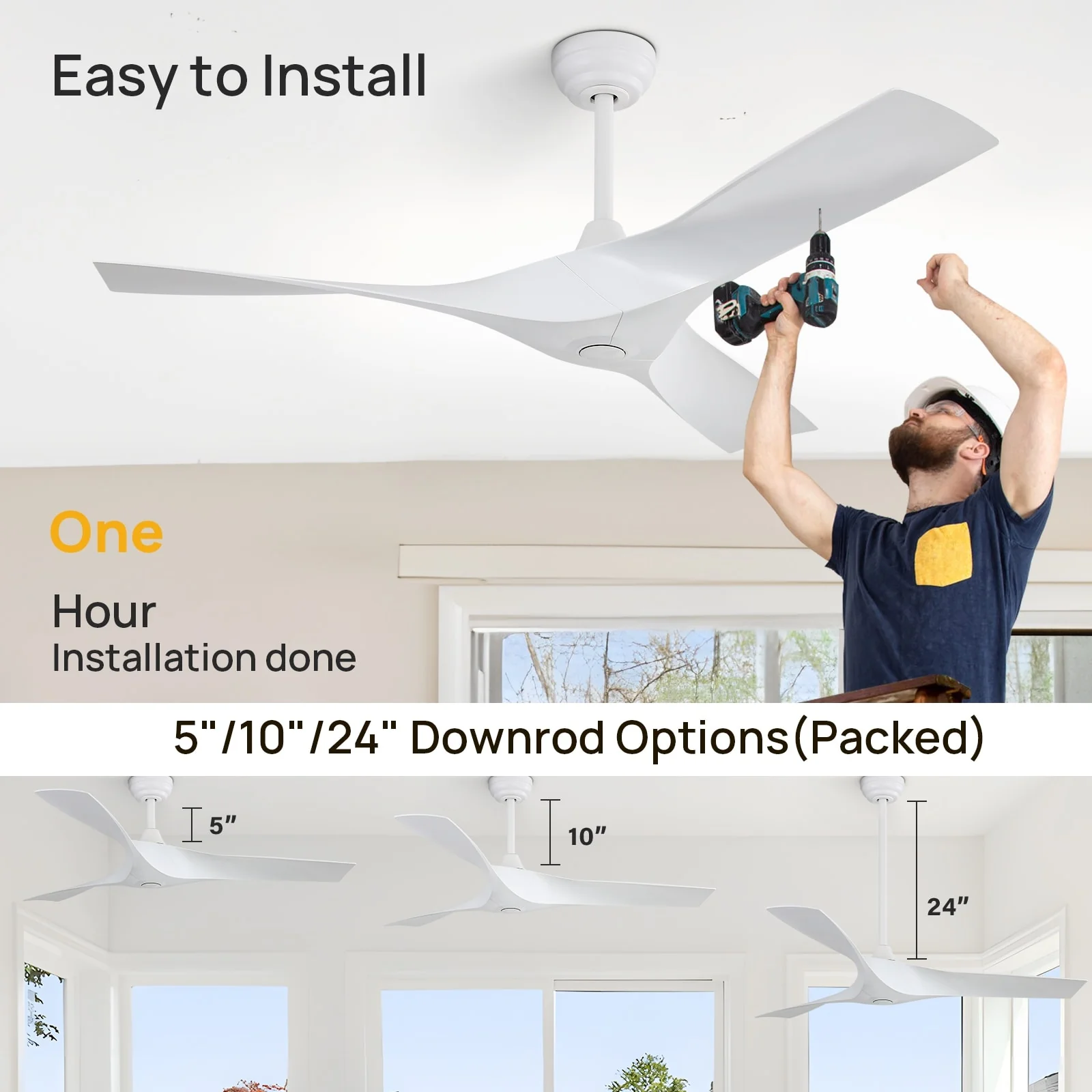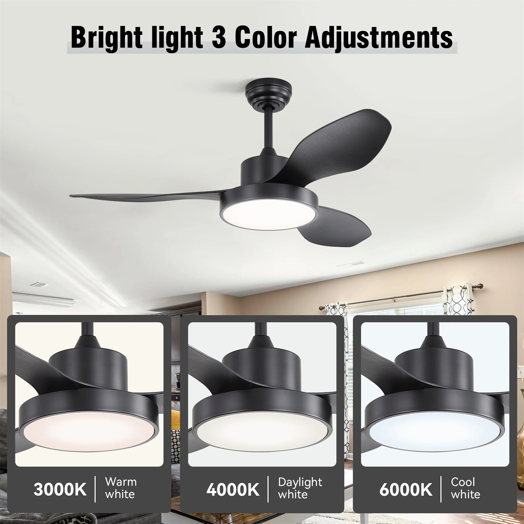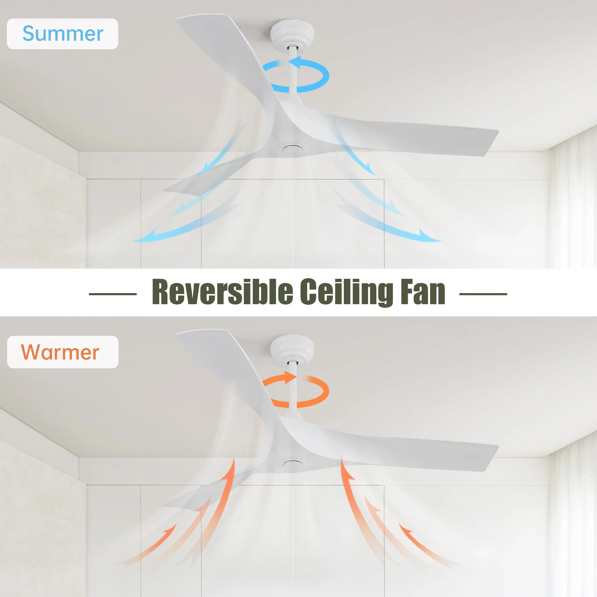 52 inch Modern Ceiling Fan without Lights, 3 Blades, Remote Control, Reversible Airflow - 52 inches