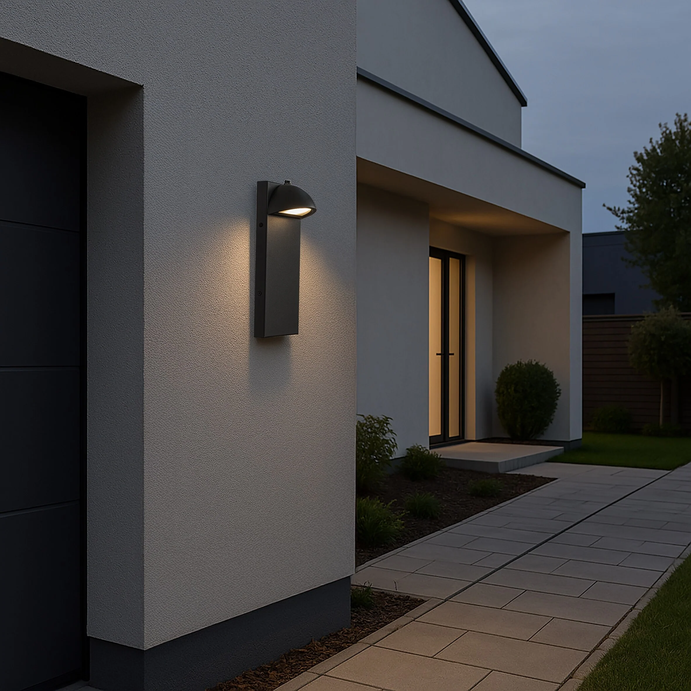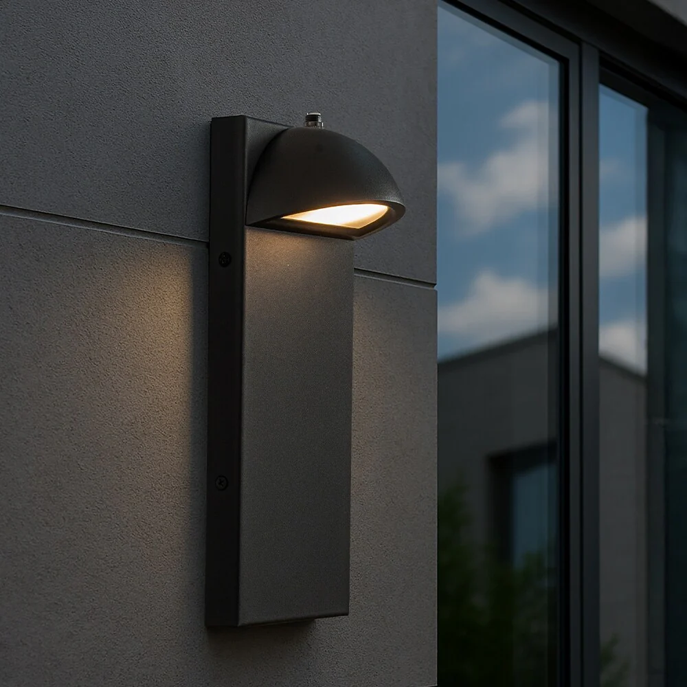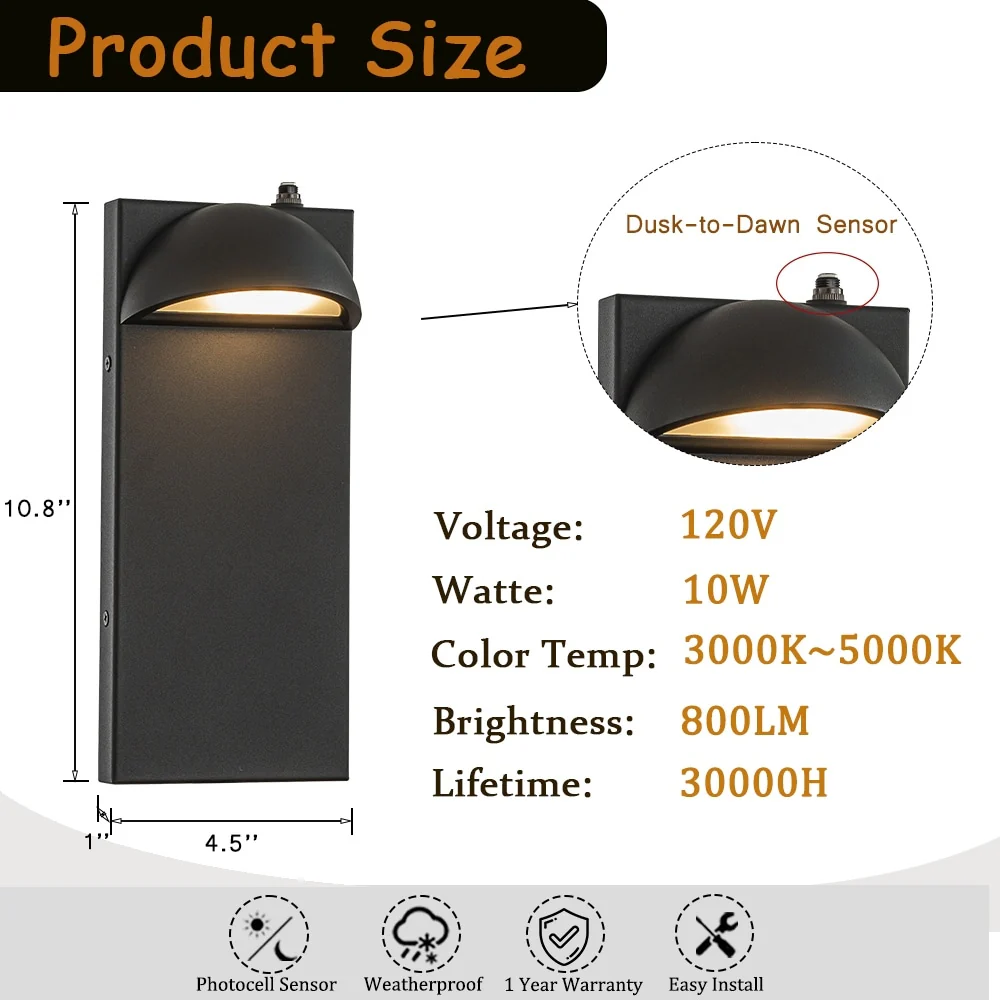 Modern Outdoor Integrated LED Wall Light with Dusk-to-Dawn Sensor Minimalist Lines Black Exterior Sconce with Frosted Glass