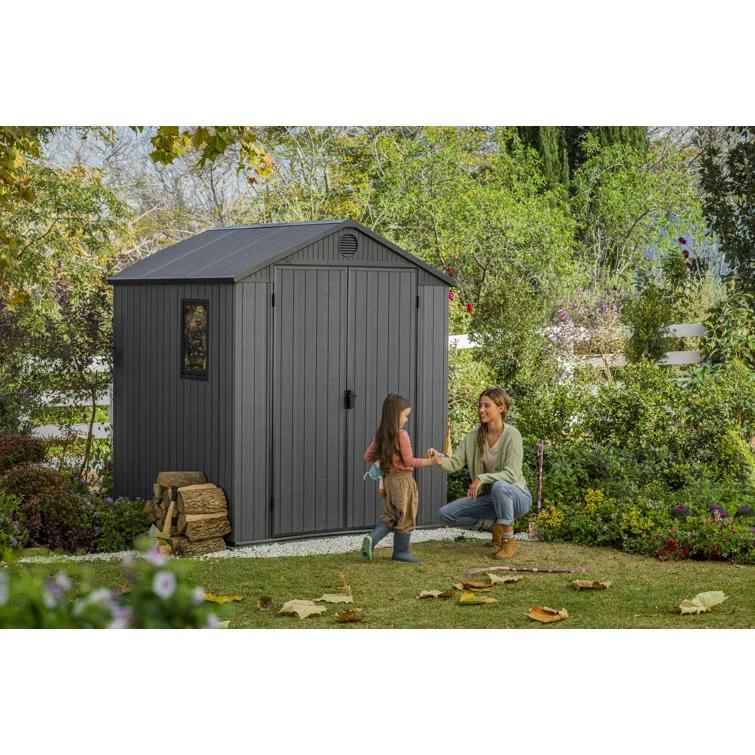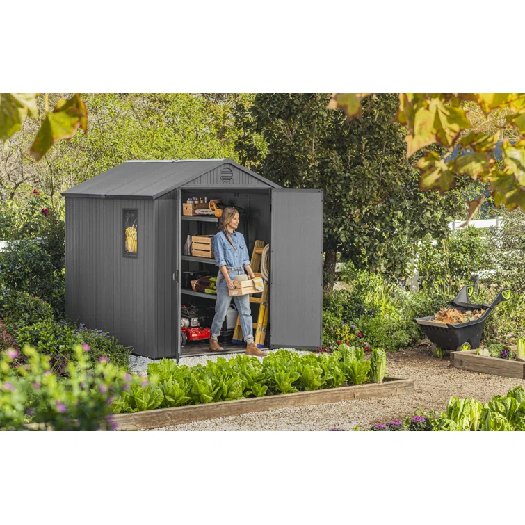 Keter Darwin 6x 8 ft. Durable Resin Outdoor Storage Shed With Floor and Double Doors for Garden Patio Furniture and Tools, Graphite