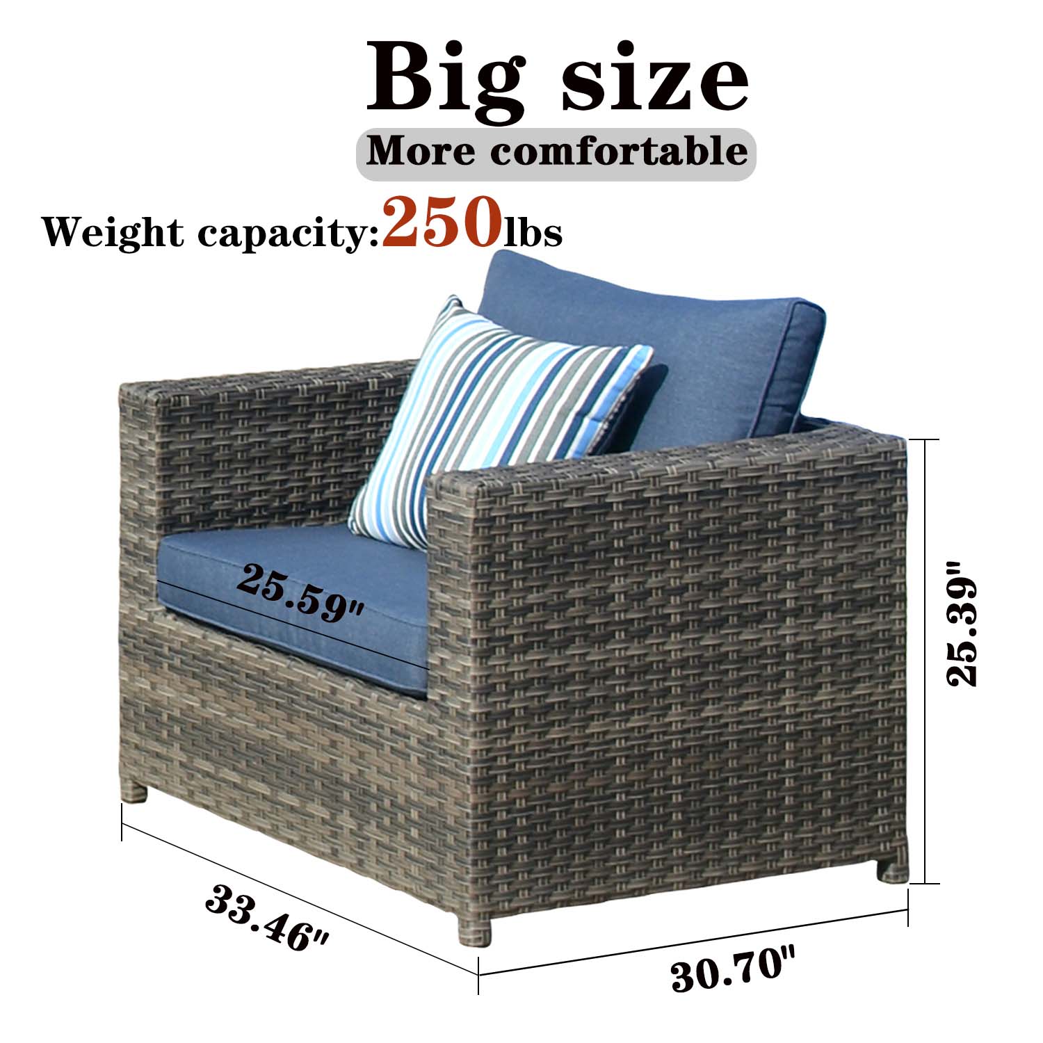 | Size | Armless Chair Size: 25.19" L?? x?? 30.70" W?? x?? 25.39" H ?? Single Chair Size: 33.46" L?? x?? 30.70" W?? x?? 25.39" H Ottoman: 25.19" L?? x?? 25.19" W?? x?? 10.23" H |