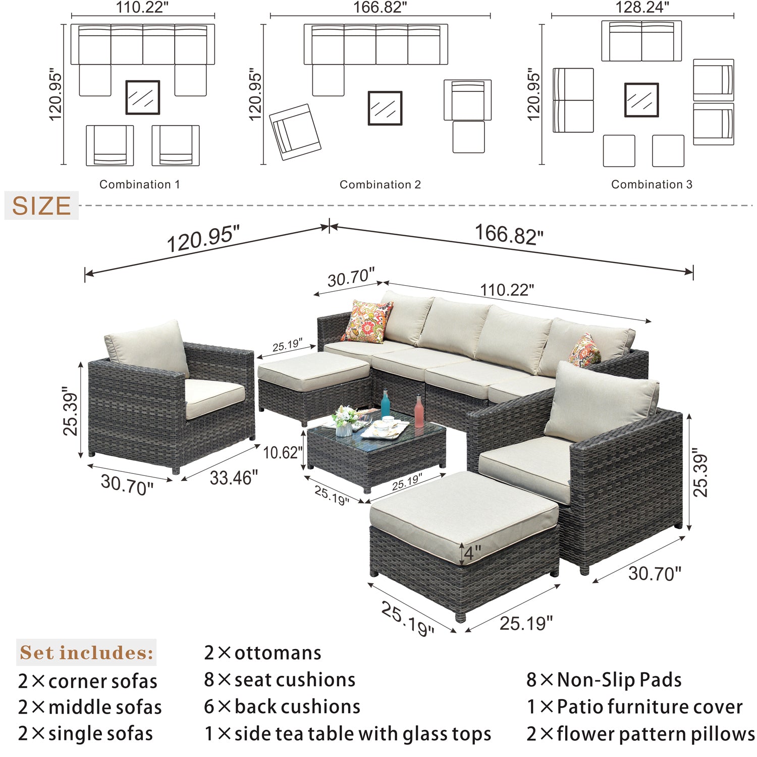 Deep Seat & Big Size:??This set is a big size patio furniture set for most people to sit, suitable for 6~7 people. And its deep seat ensures that most people will feel comfortable when they sit on it. No assembly is required.