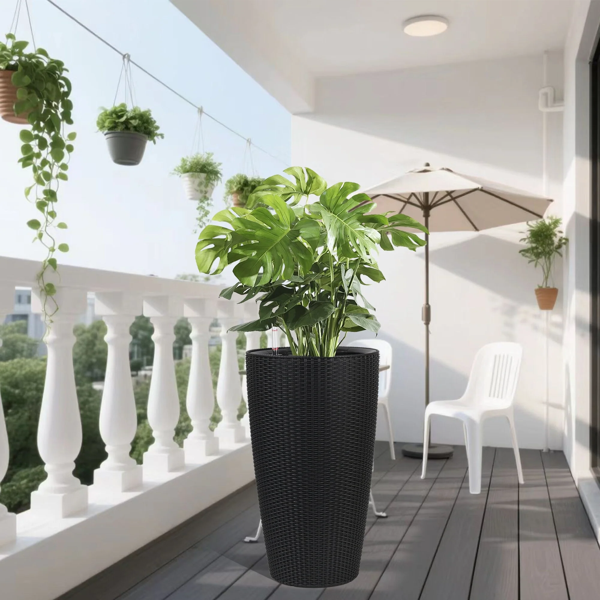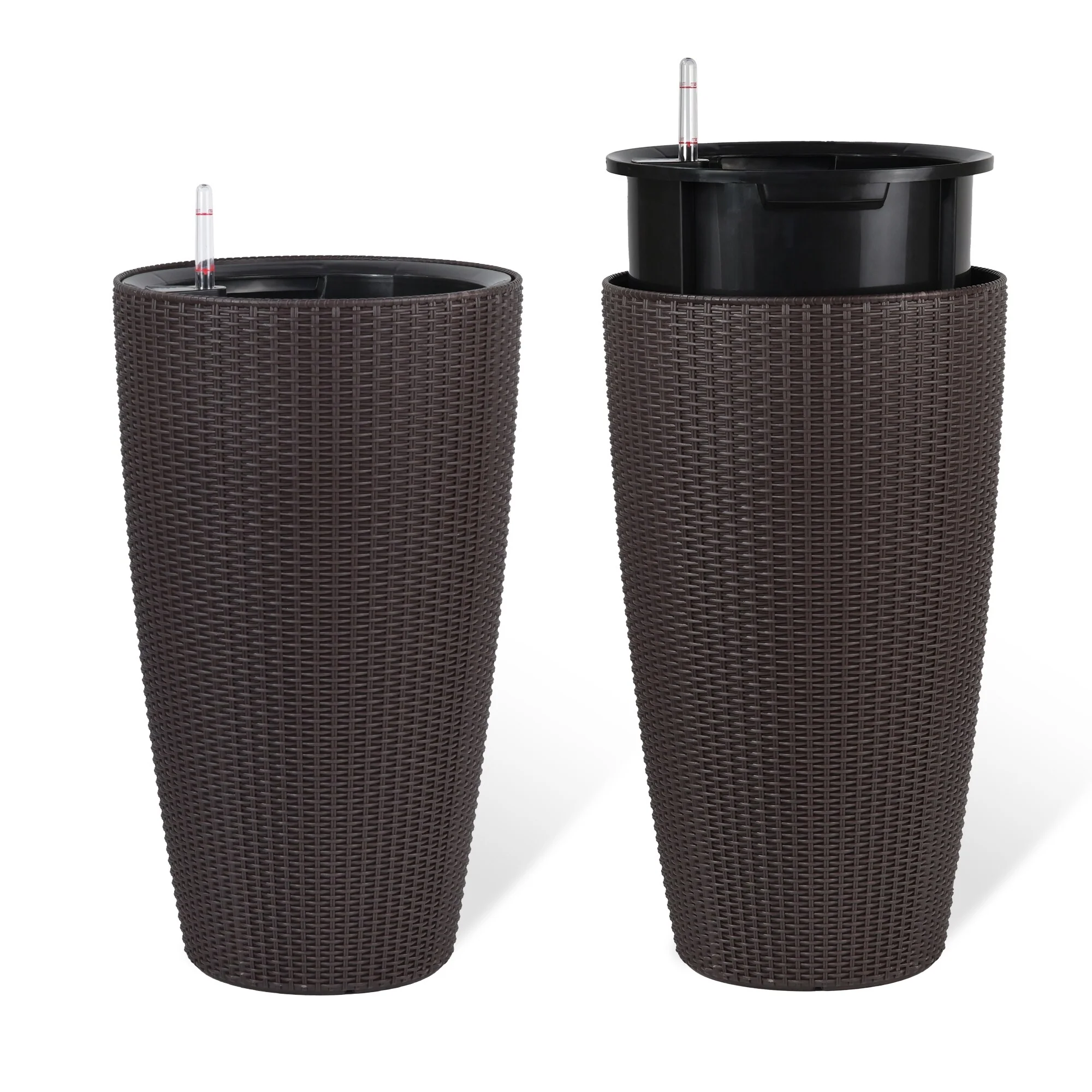 Set of 2 Faux Rattan Tall Planters Outdoor Indoor Large Planters with Water Level Monitor Inner Bucket,Automatic Watering