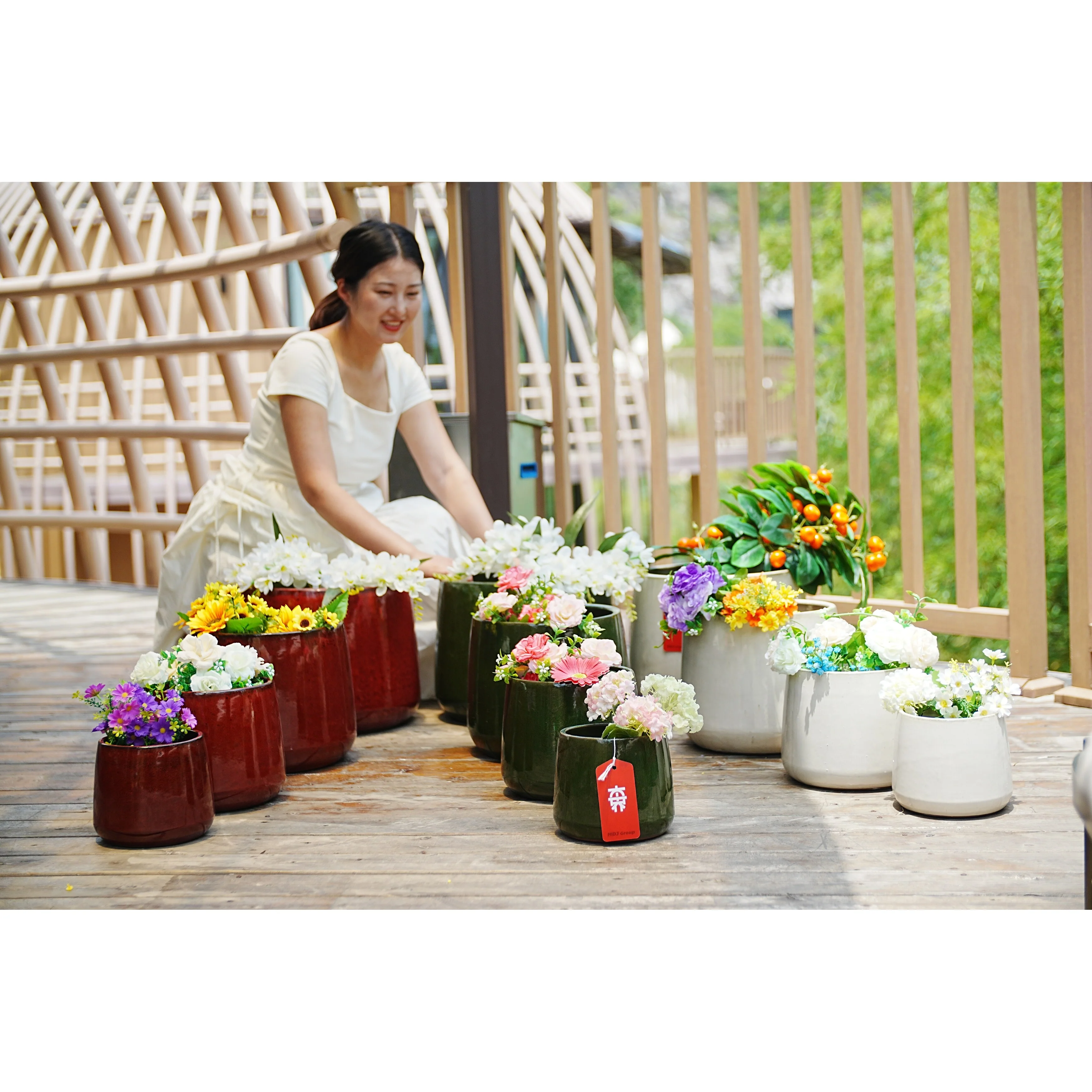 American White Oak Ceramic Planter Set of 4 Modern 14 Inch Square Outdoor Pots with Drainage Weatherproof