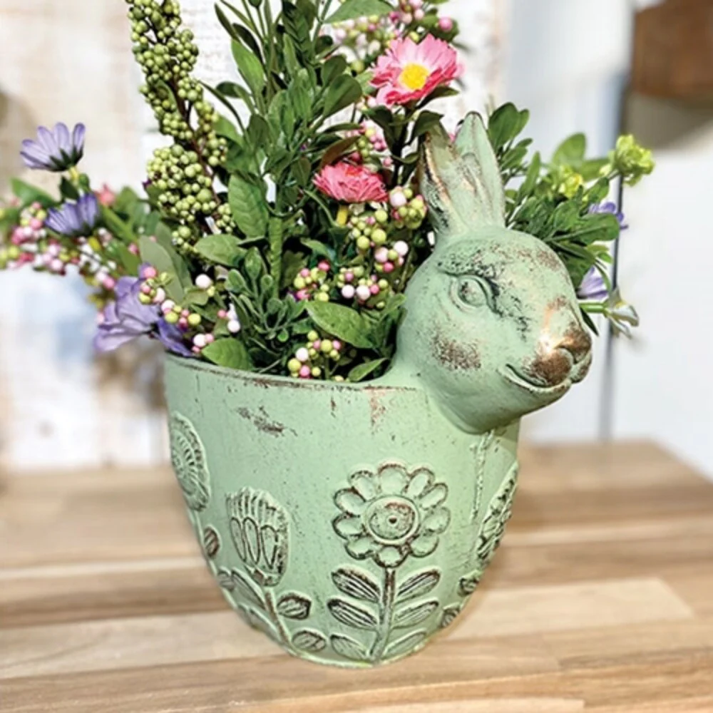 Distressed Green Cement Bunny Flower Planter Embossed Design Indoor Outdoor Rustic Decor - 8.5" H x 8" W x 5" D