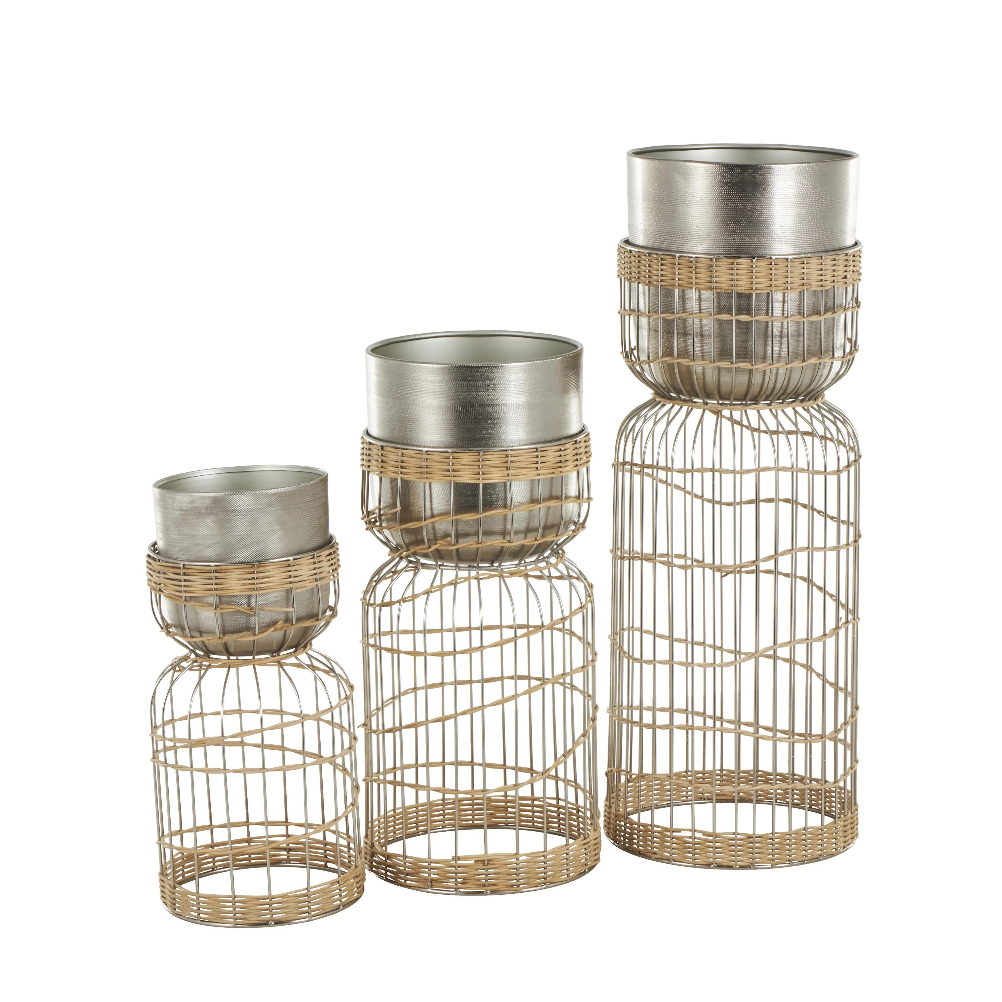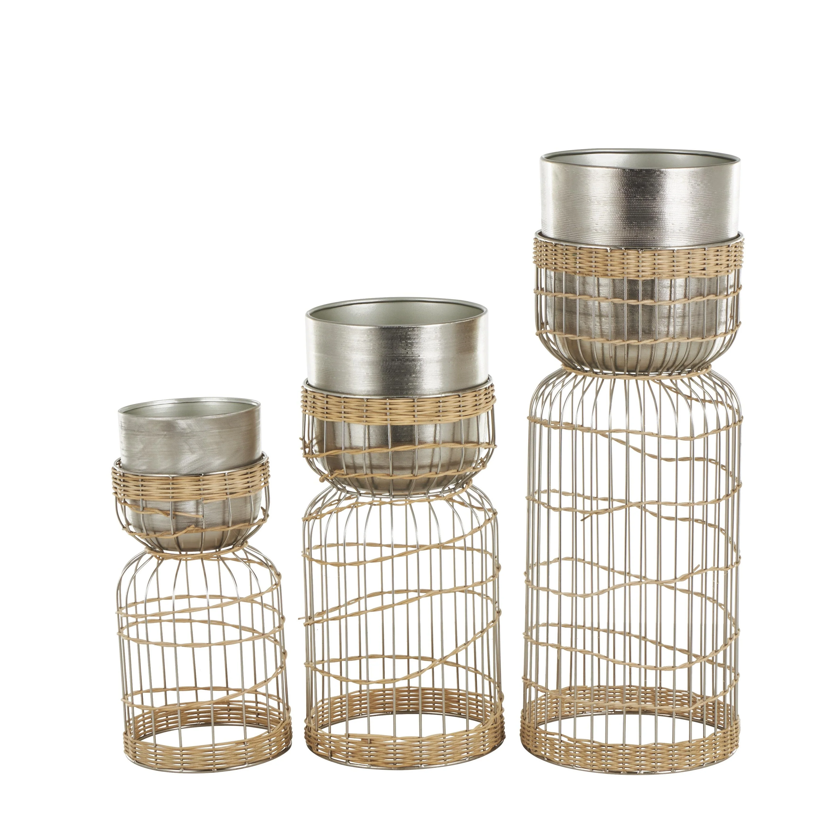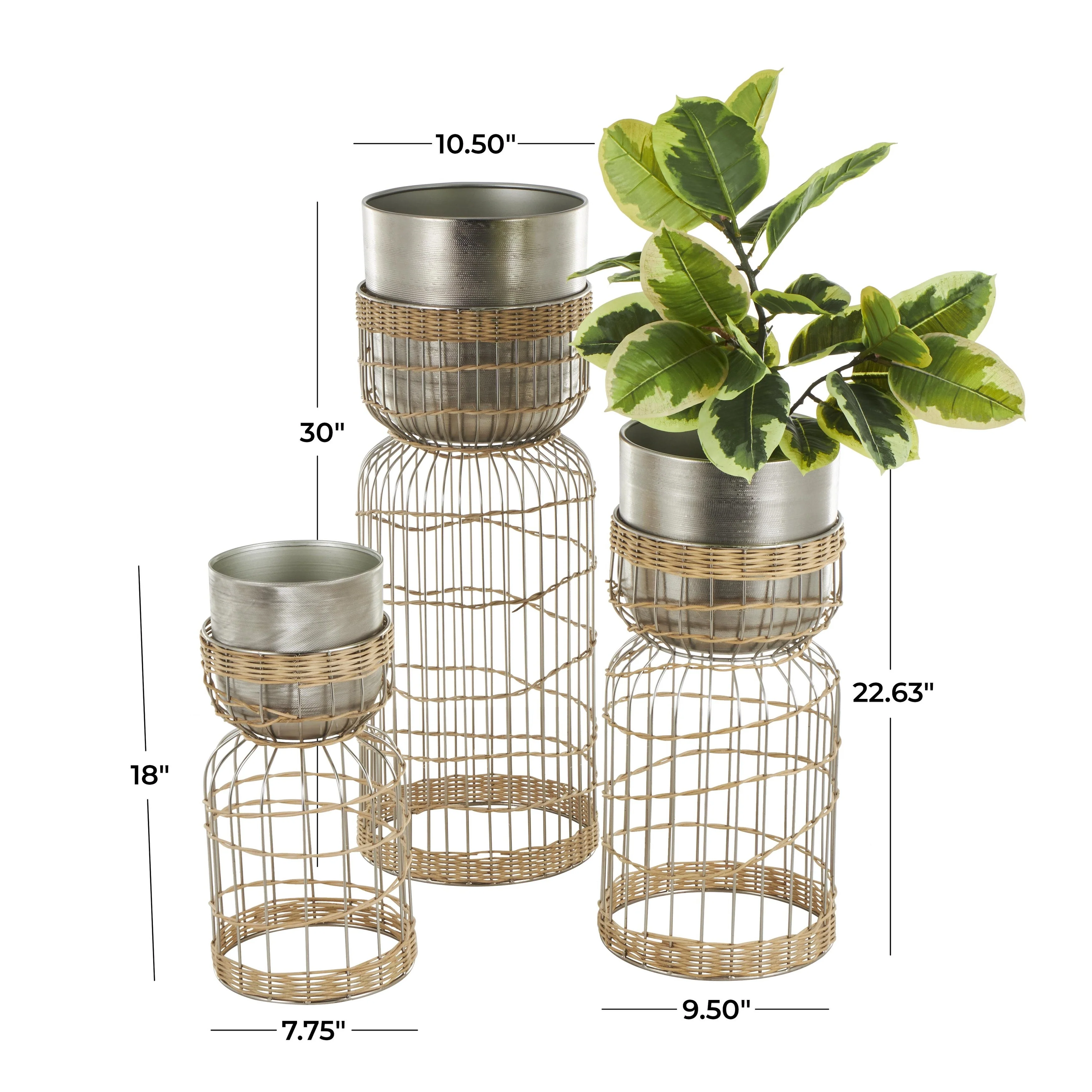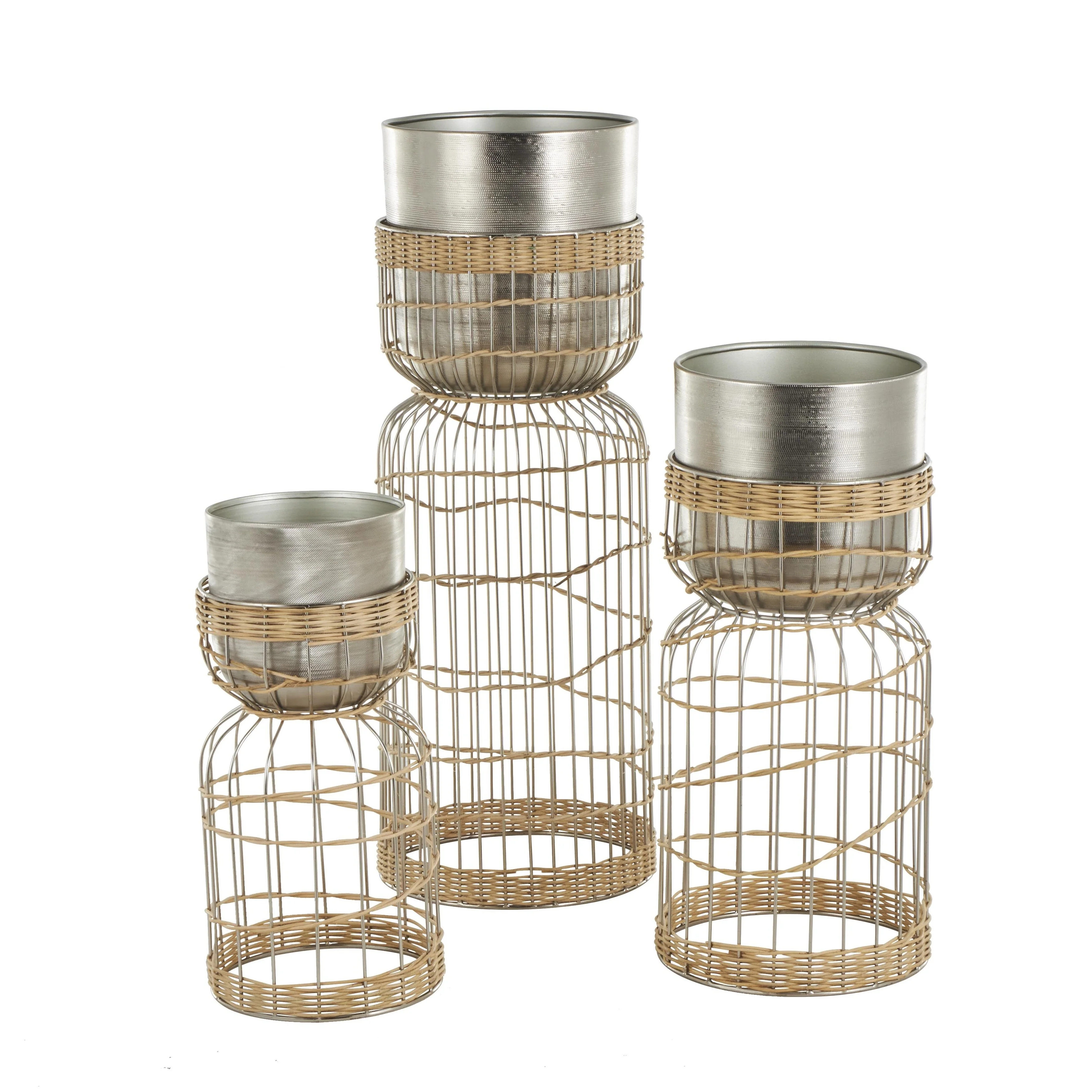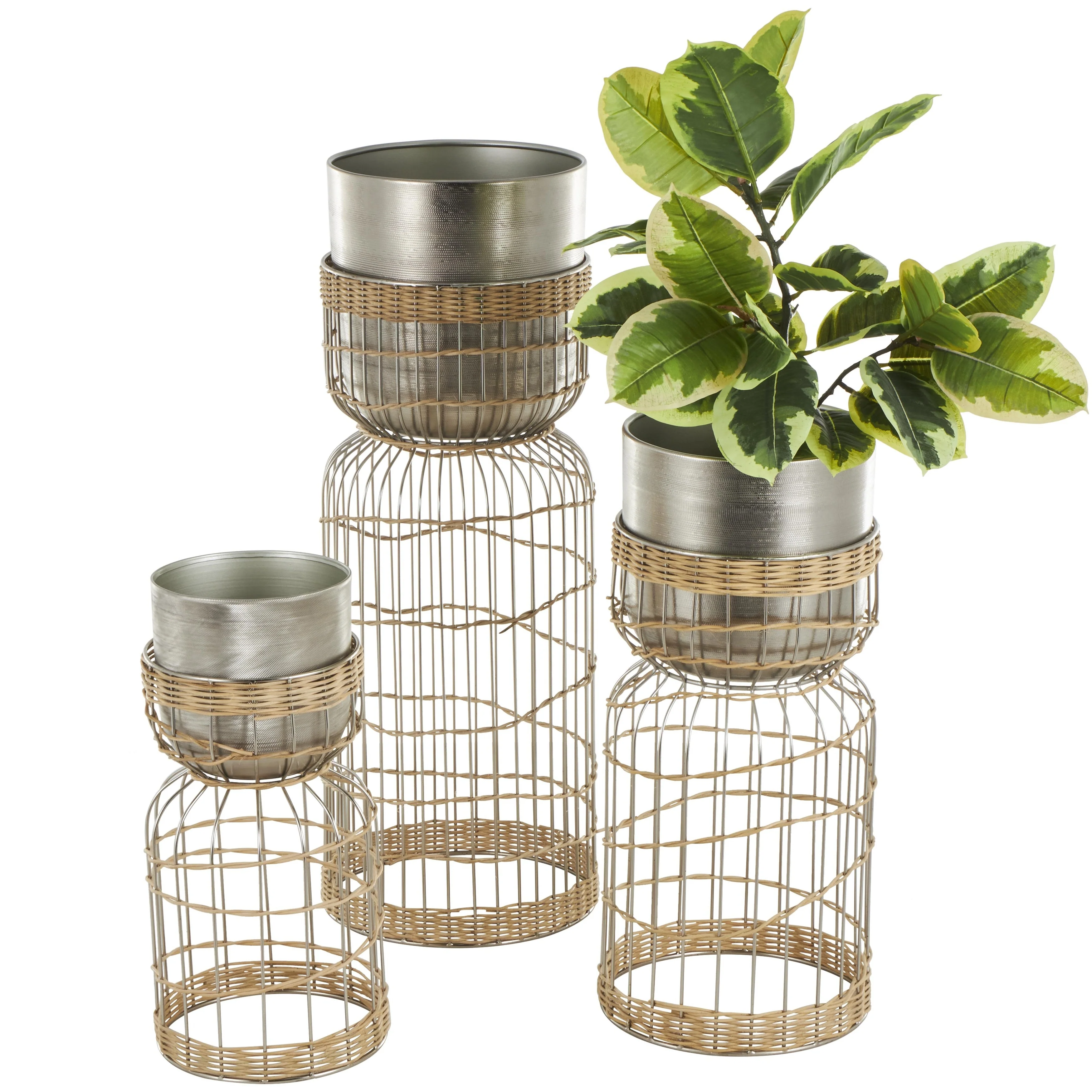 Metal Textured Dome Indoor Planter with Woven Seagrass or Rattan and Cage Rod Base - Set of 3 Gold or Silver - Roche River Decor