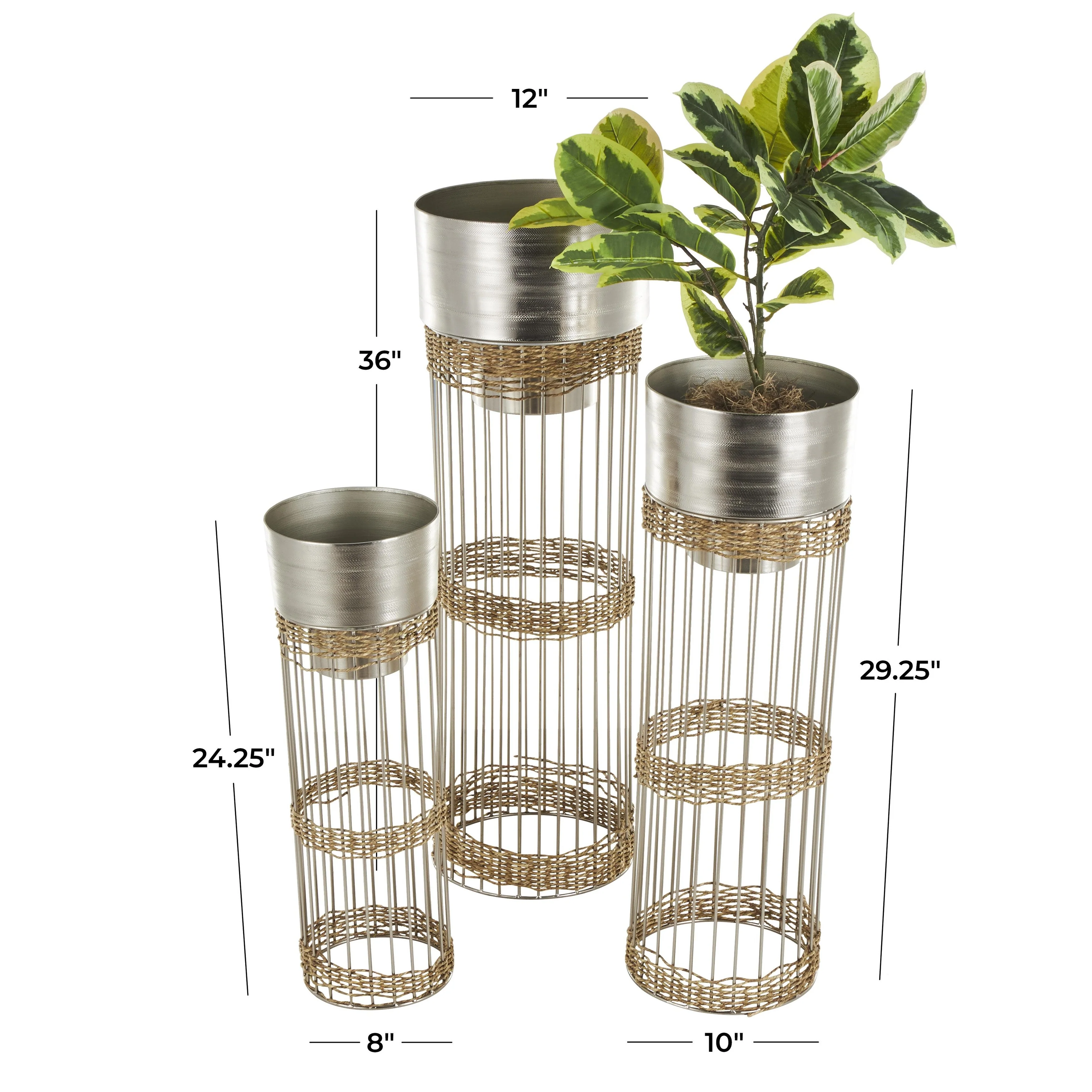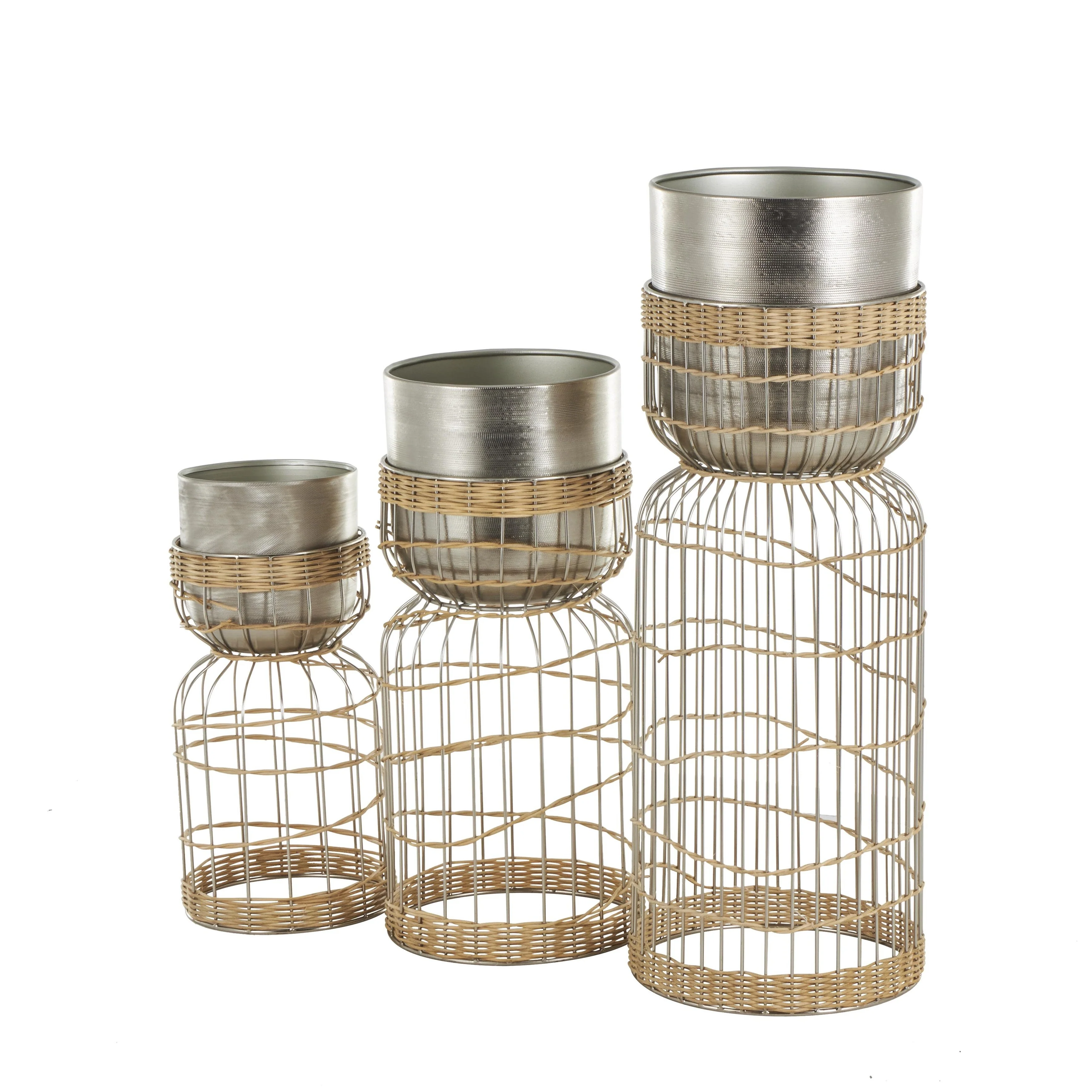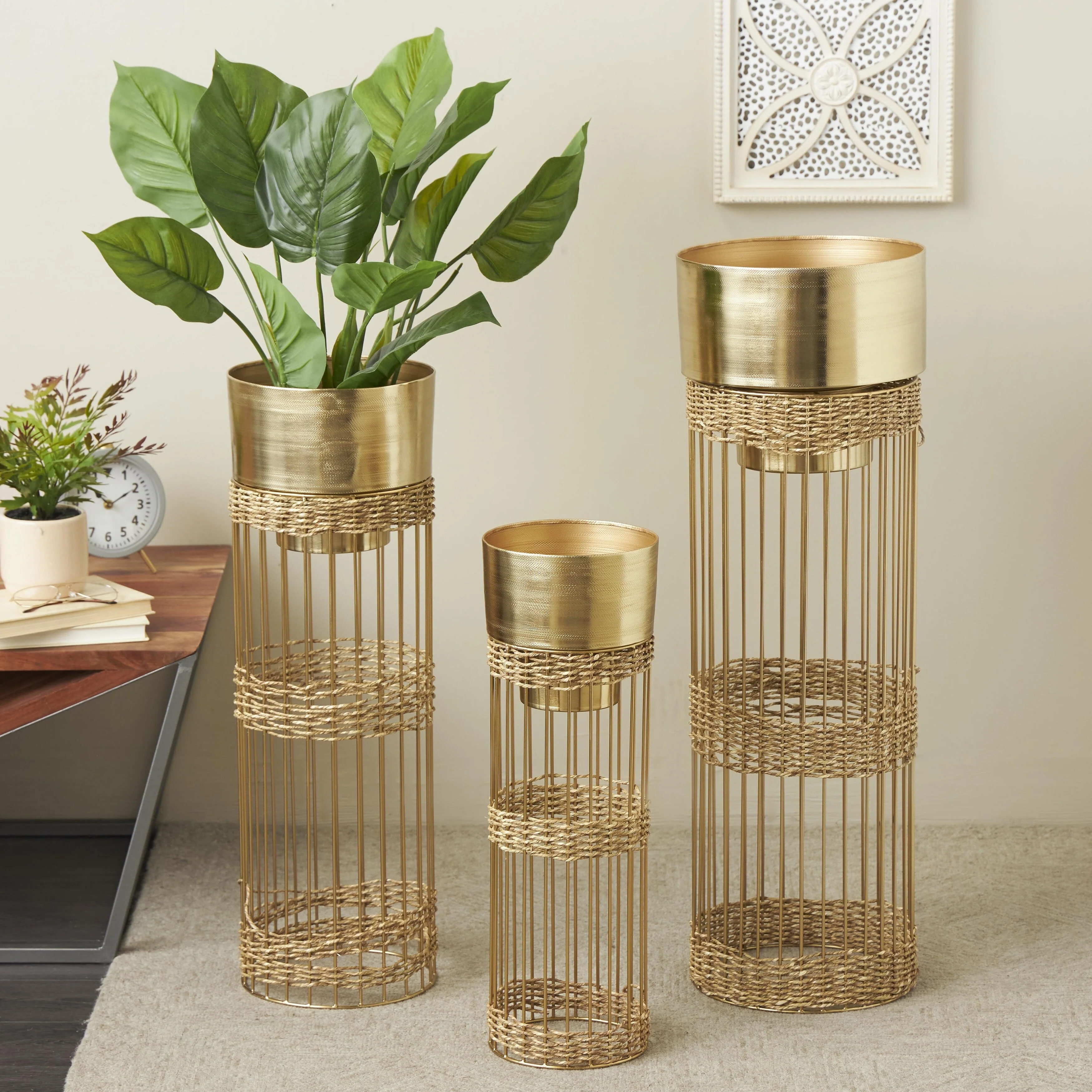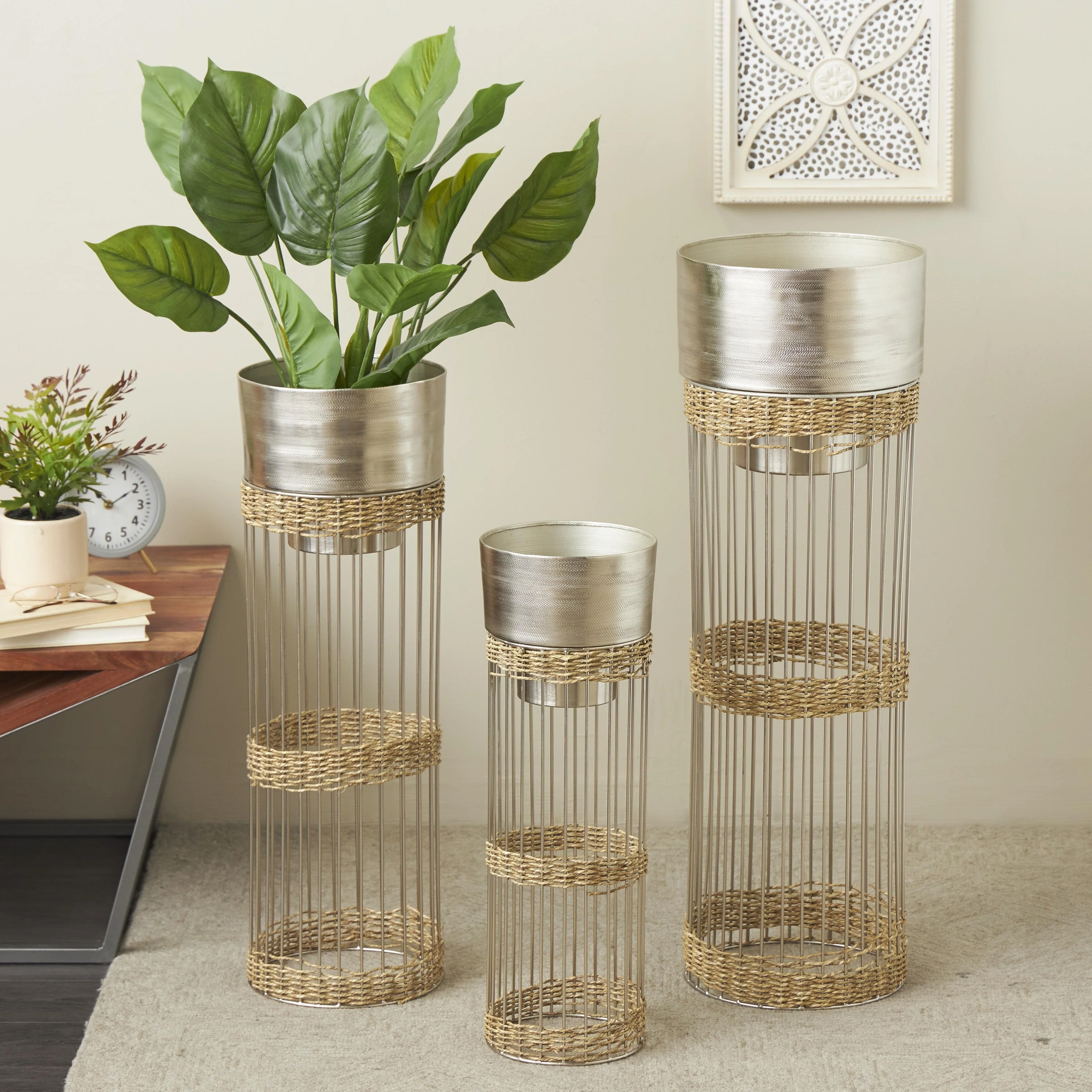 Metal Textured Dome Indoor Planter with Woven Seagrass or Rattan and Cage Rod Base - Set of 3 Gold or Silver - Roche River Decor