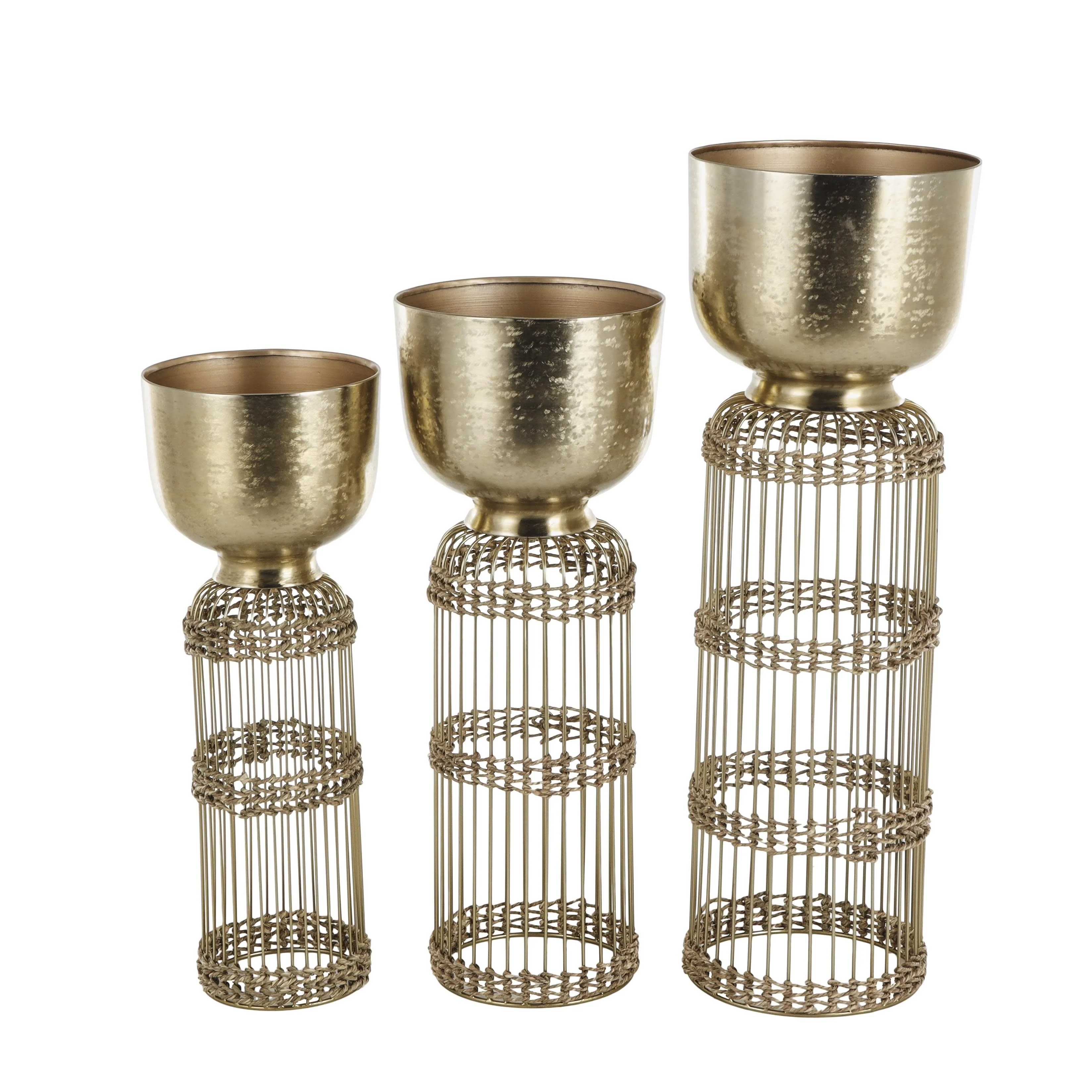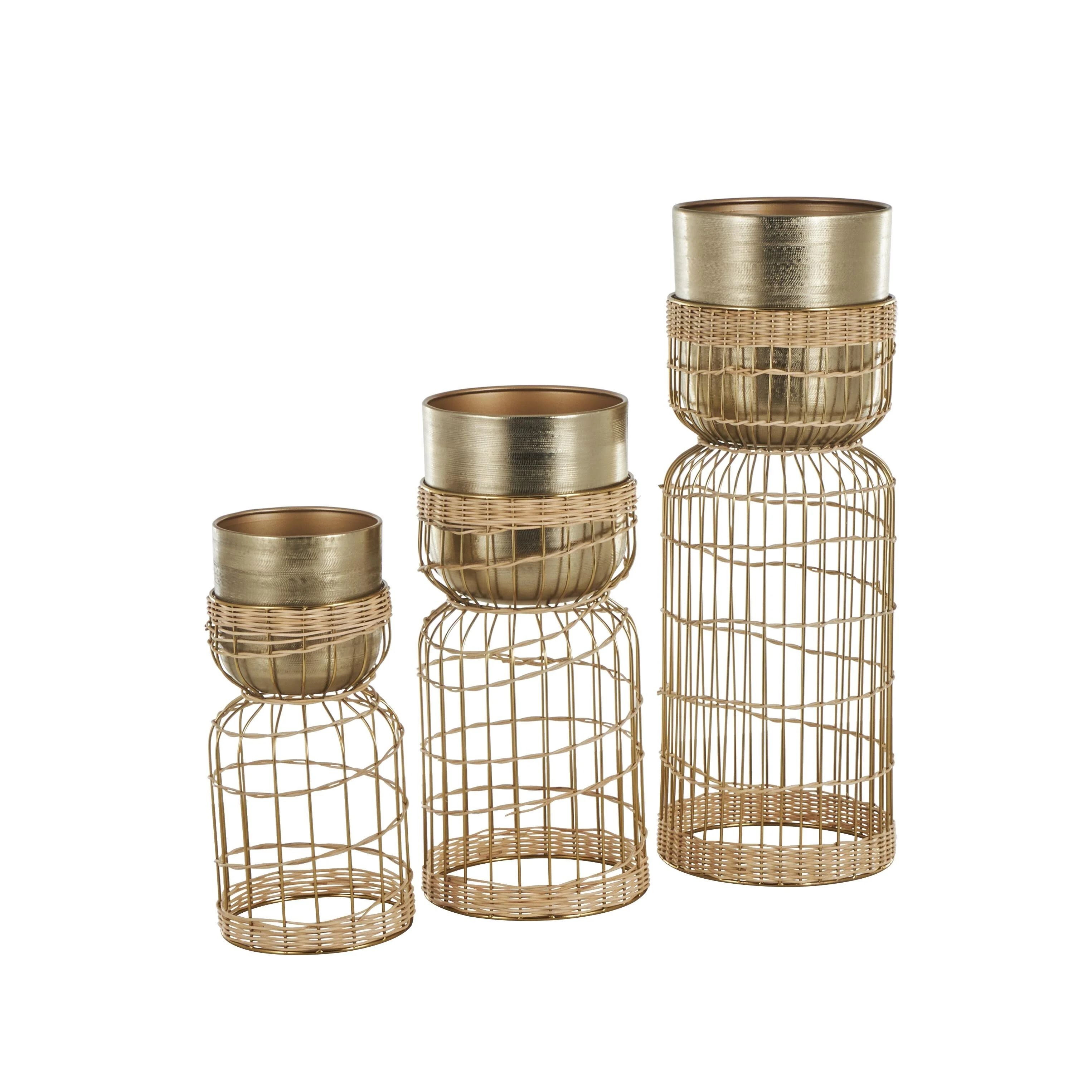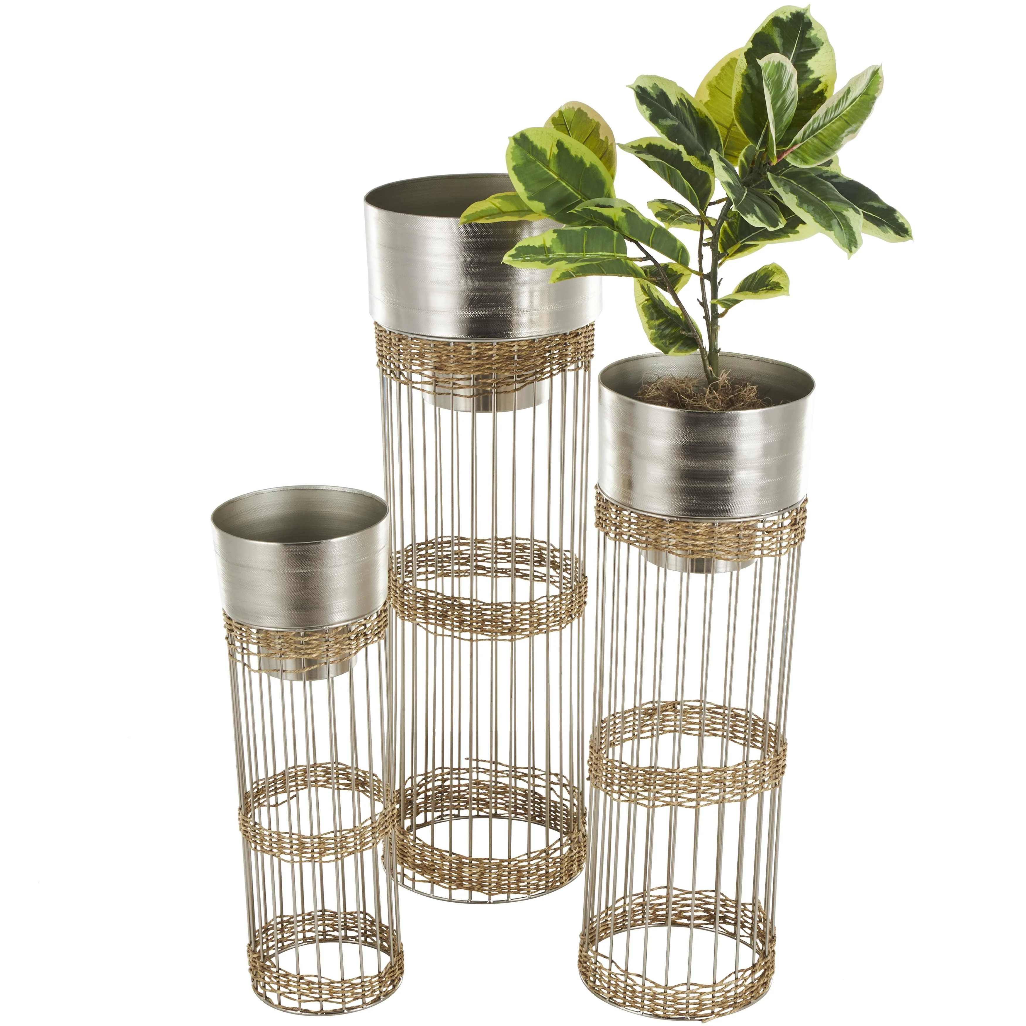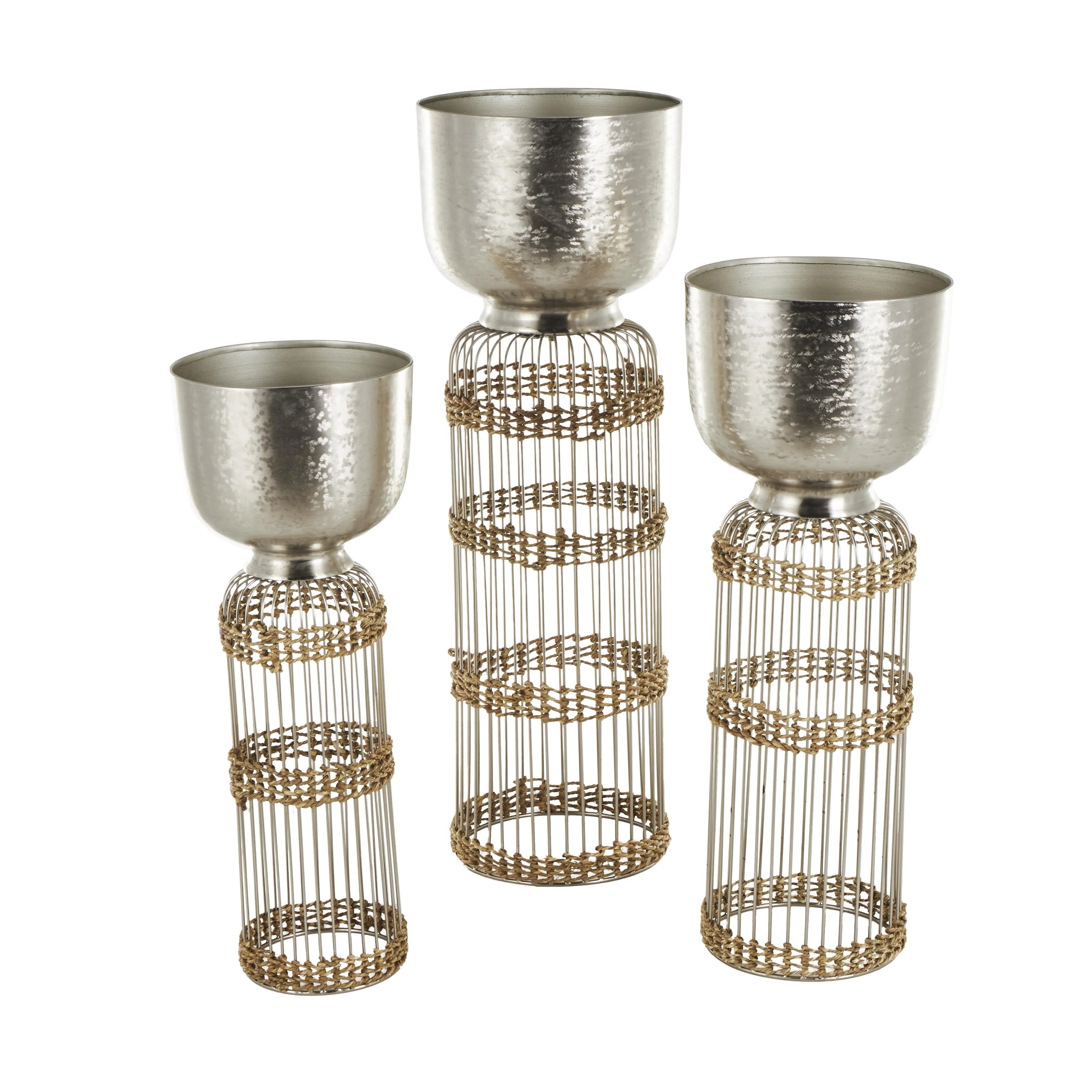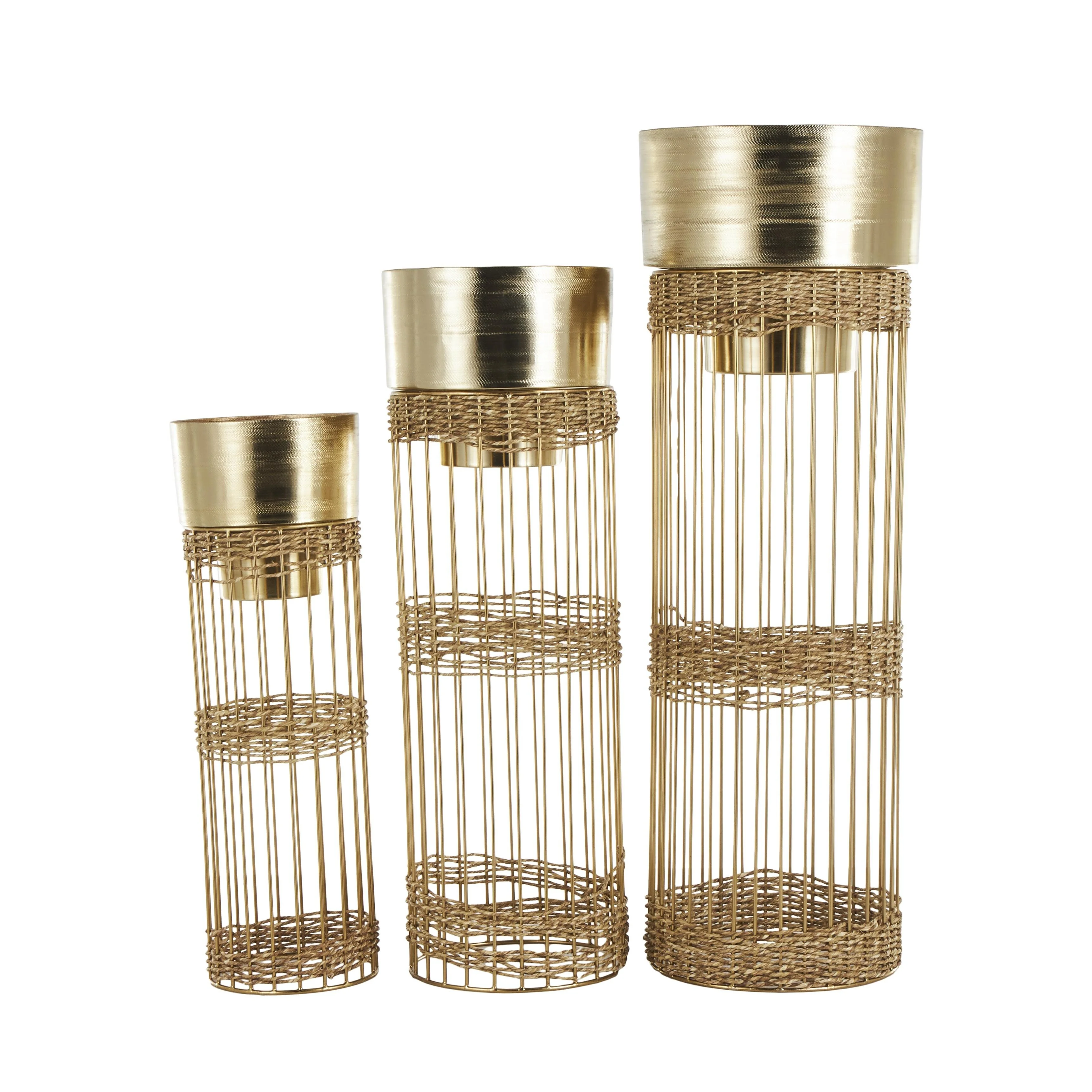Metal Textured Dome Indoor Planter with Woven Seagrass or Rattan and Cage Rod Base - Set of 3 Gold or Silver - Roche River Decor