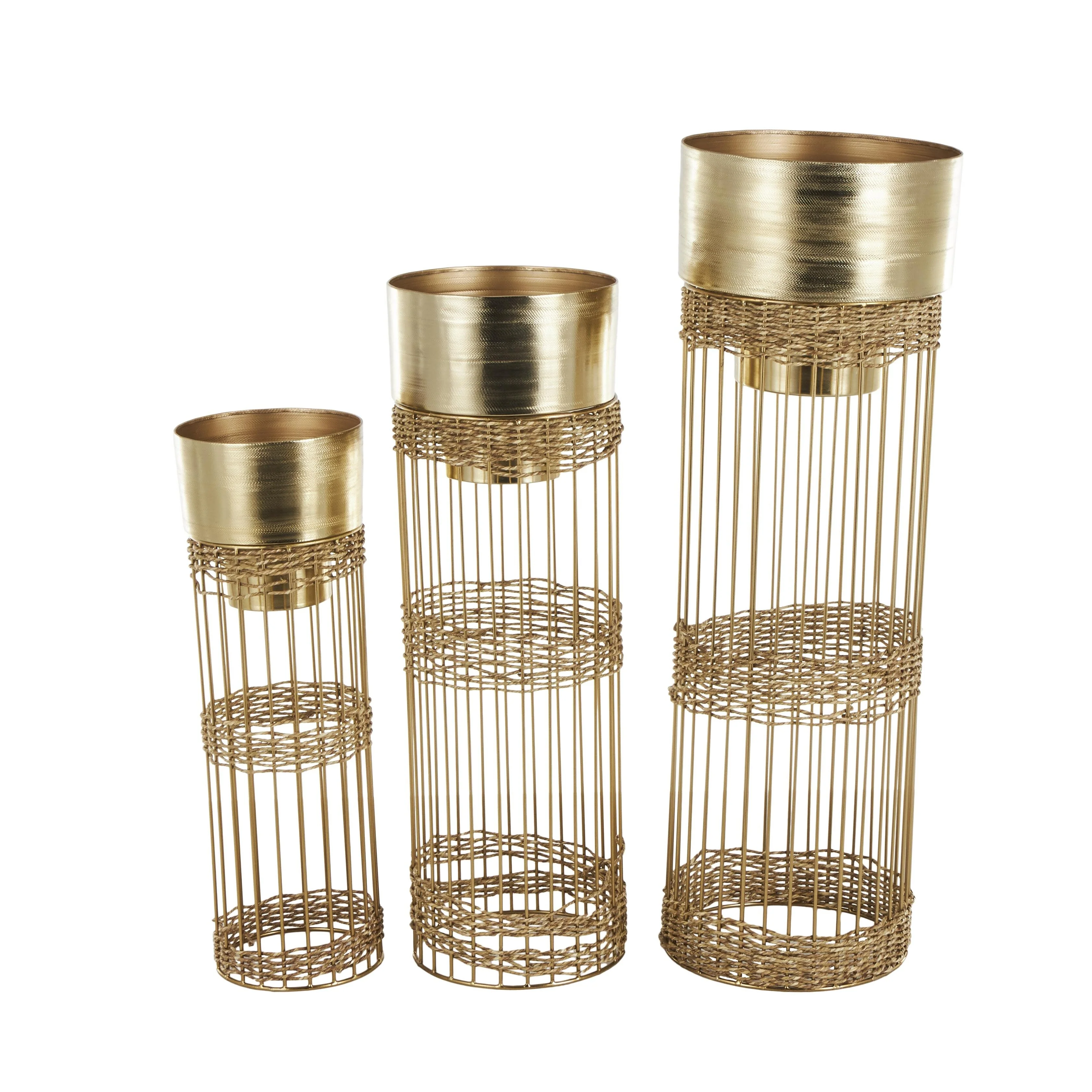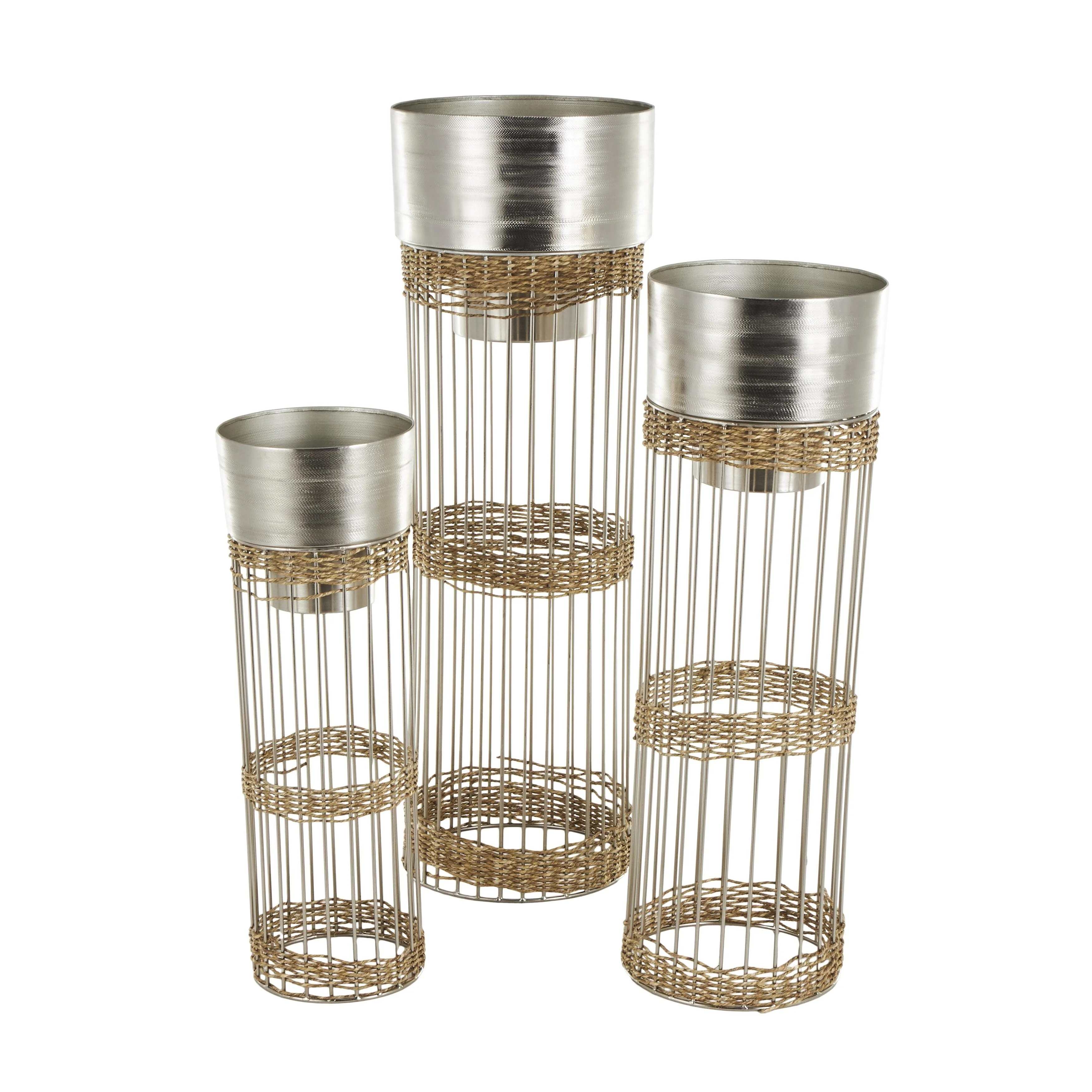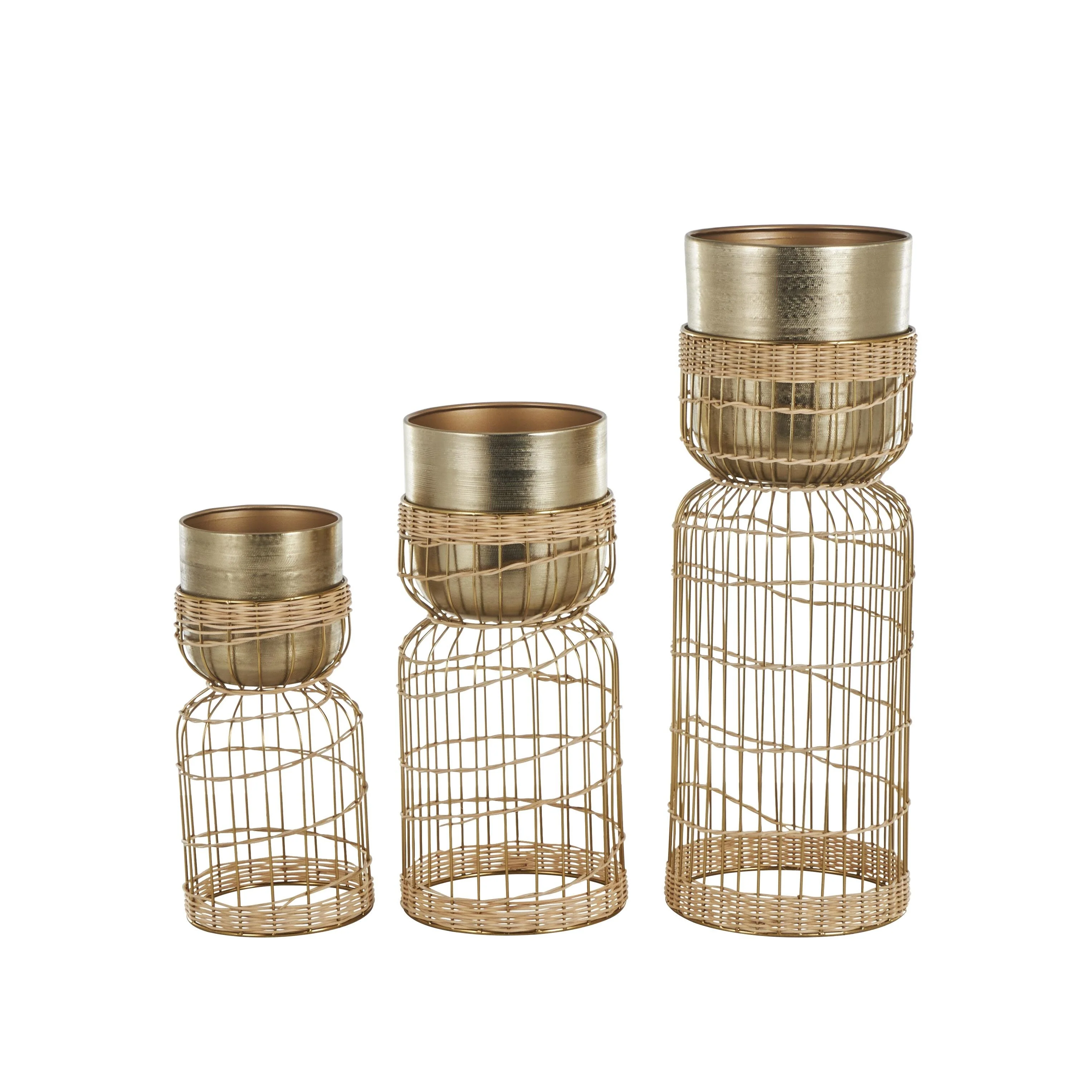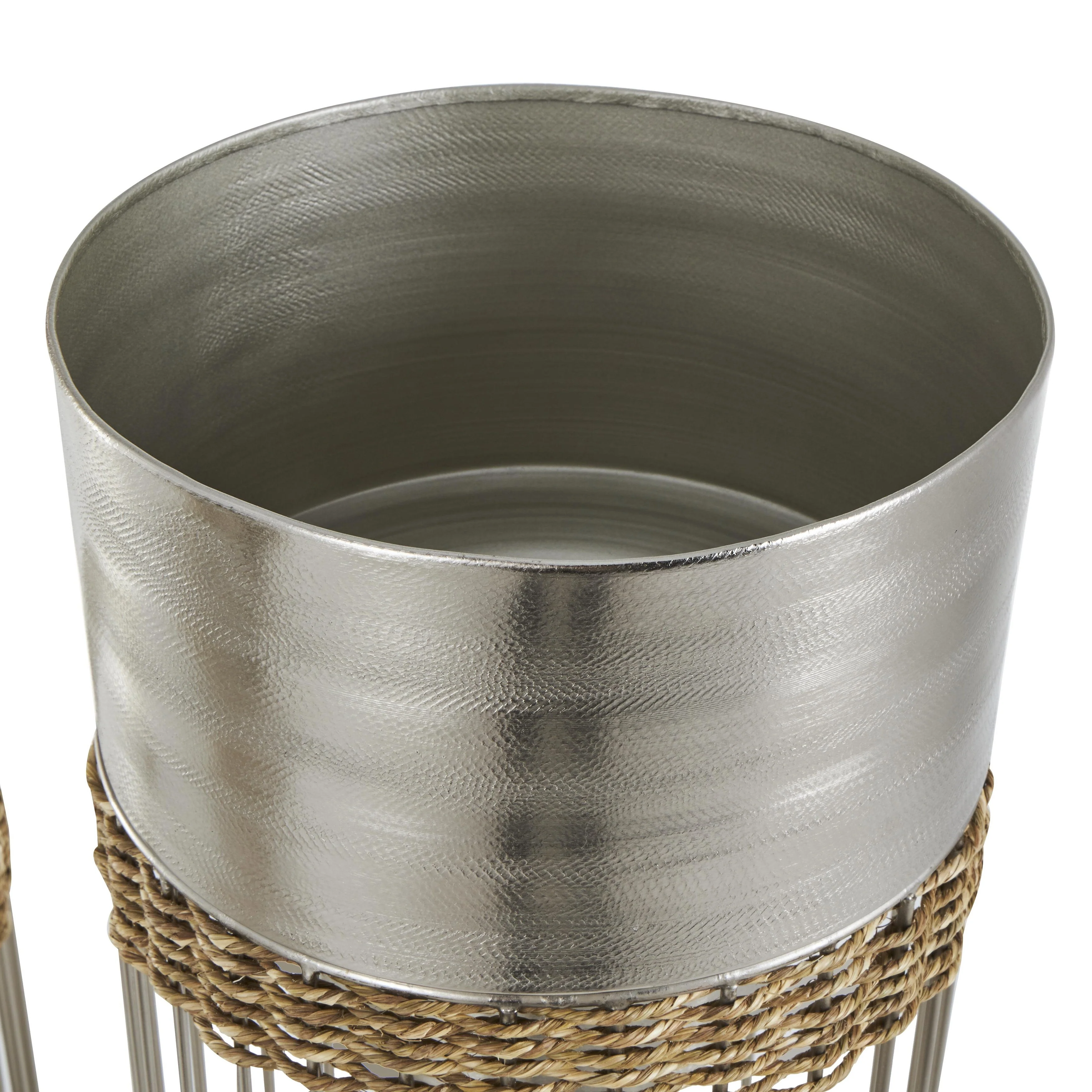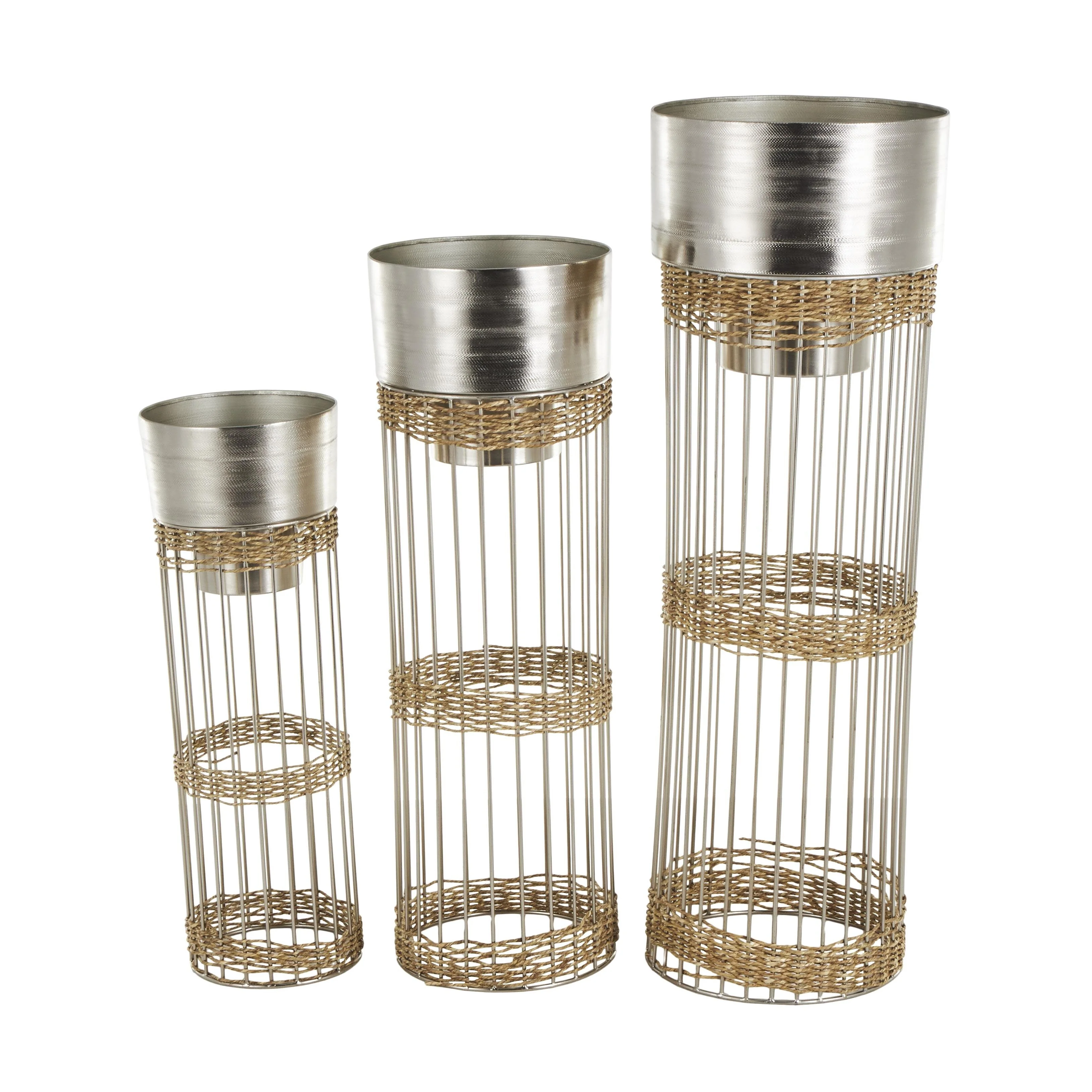 Metal Textured Dome Indoor Planter with Woven Seagrass or Rattan and Cage Rod Base - Set of 3 Gold or Silver - Roche River Decor