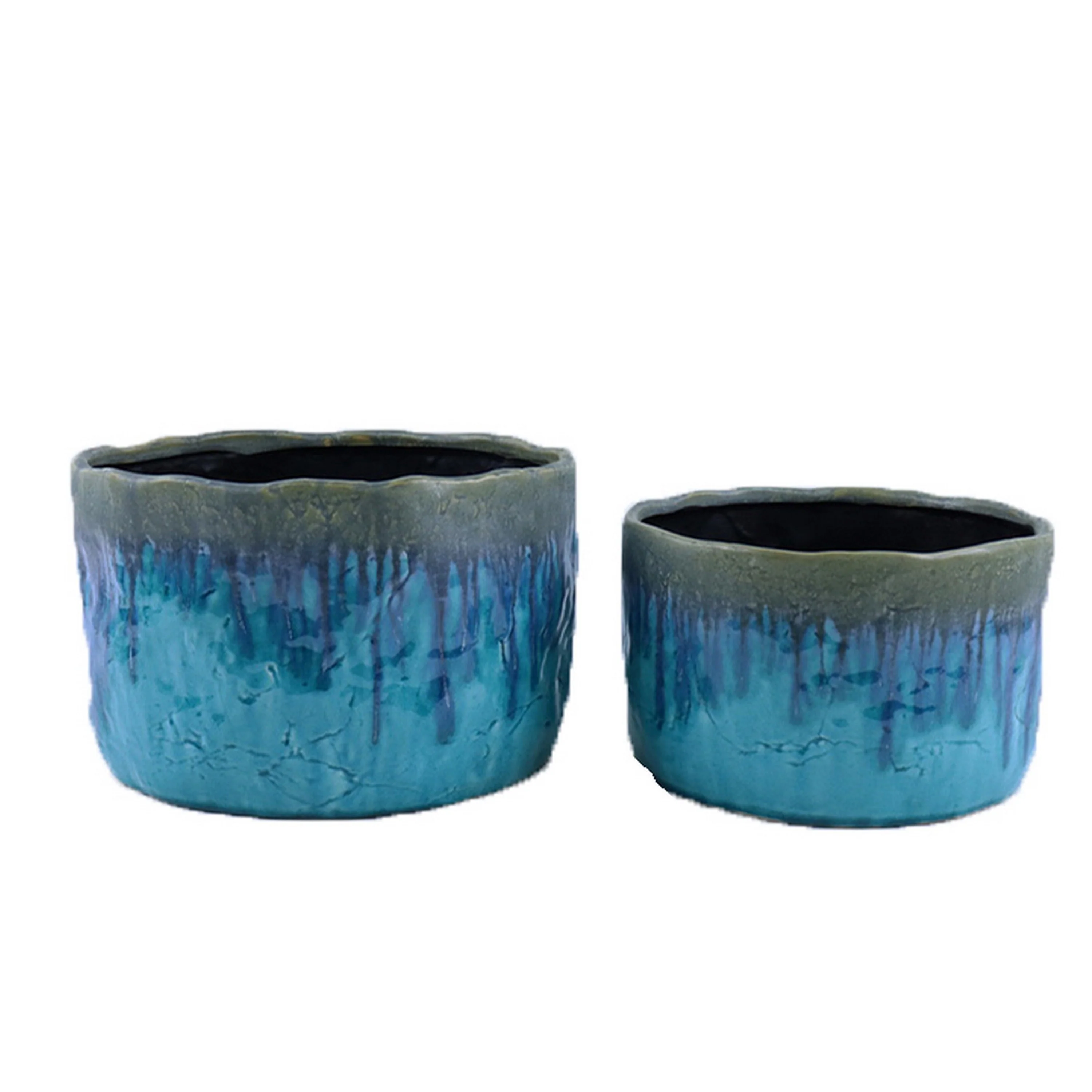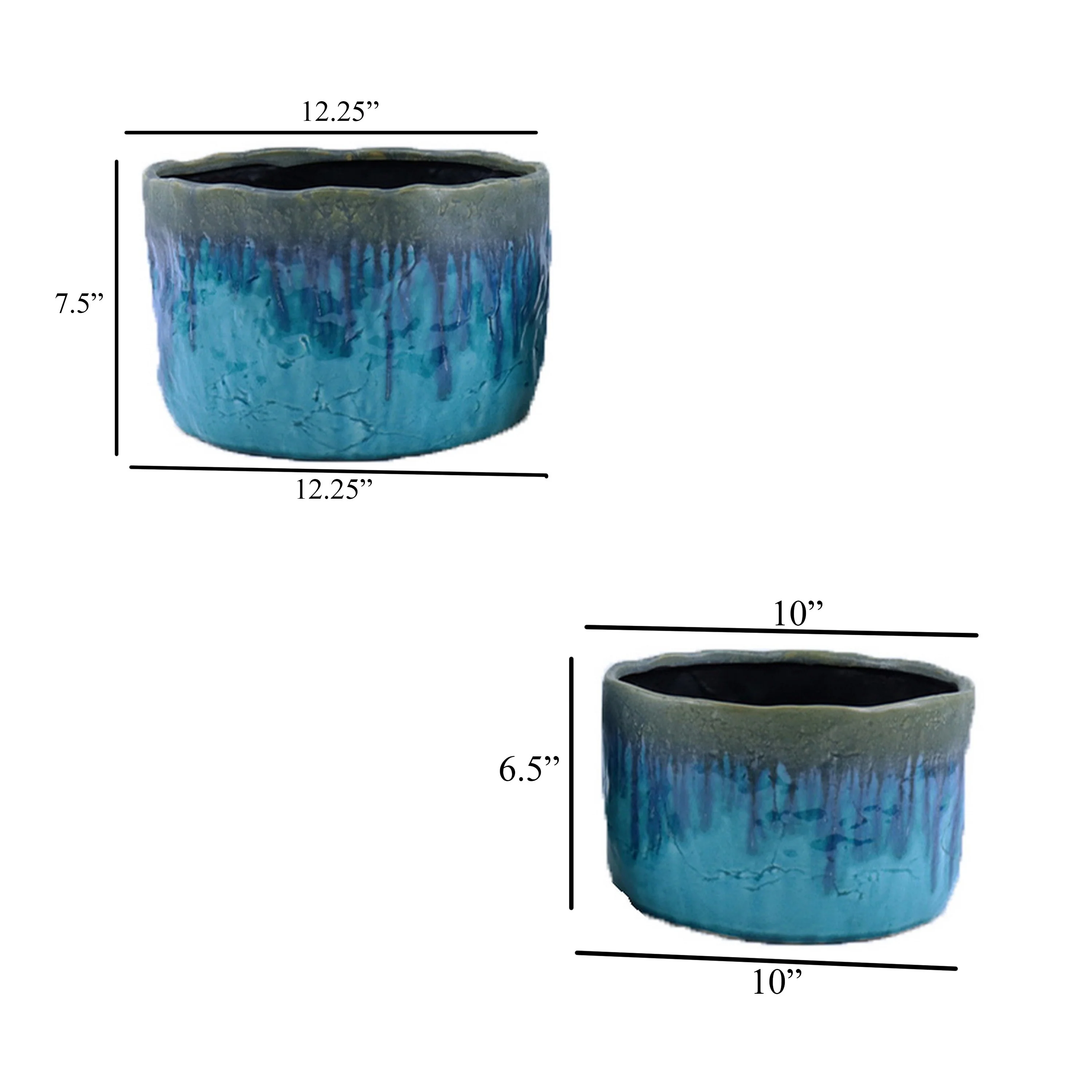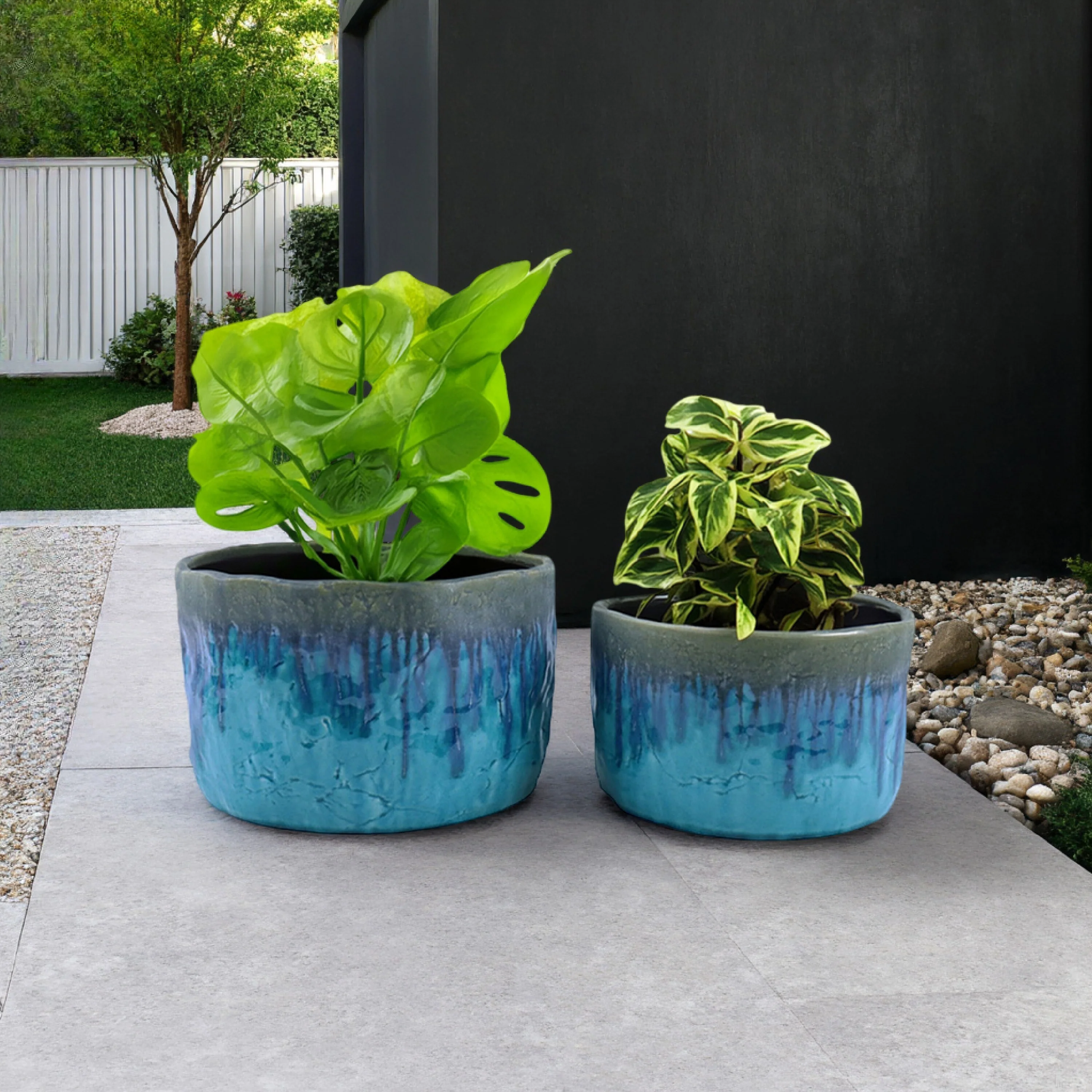 Foy Wide Planter Set of 2, Two Tone Blue Ceramic, Round, Modern Style