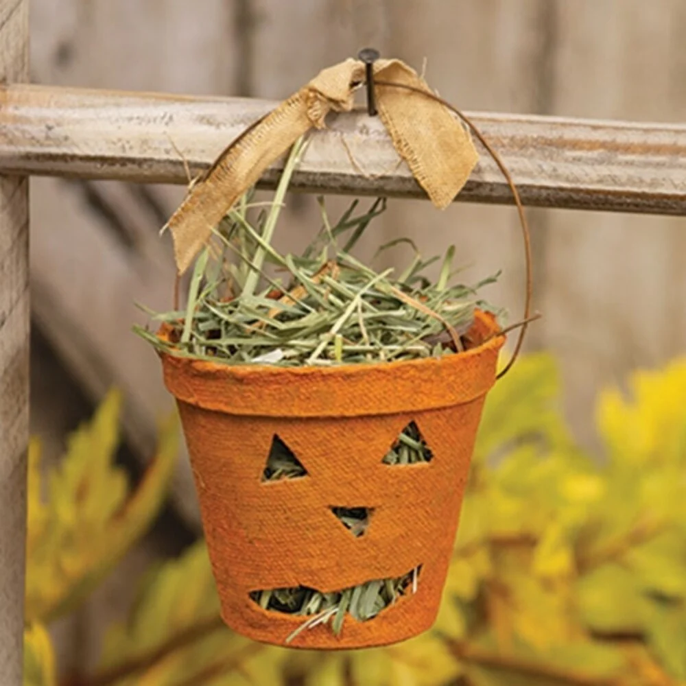 Orange Halloween Pumpkin Planter with Cutout Face and Dried Prairie Grass Rustic Decoration