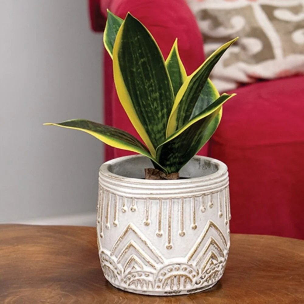 3.75 Inch Aztec Embossed Cement Planter in Distressed White with Gold Accent Perfect for Small Plants - 3.75"H x 3.75"Dia