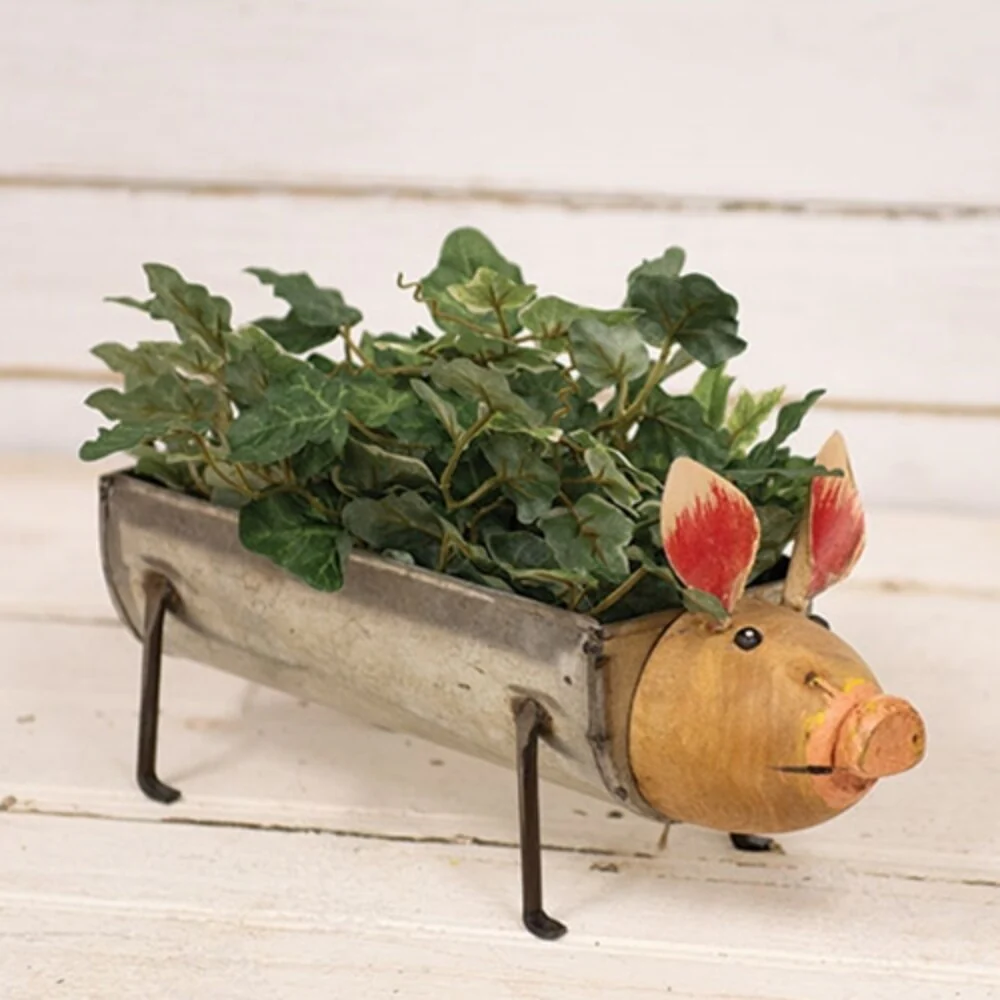 Freestanding Metal Pig Planter with Distressed Look and Wooden Head for Indoor Outdoor Use - 6.5"H x 13.25"W x 4"D
