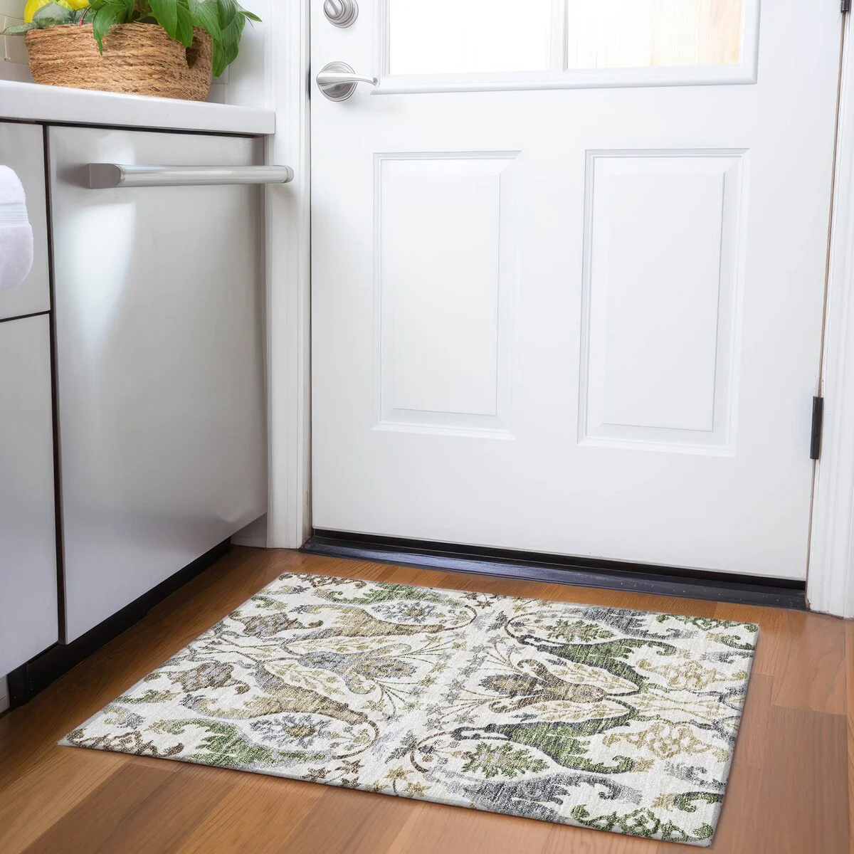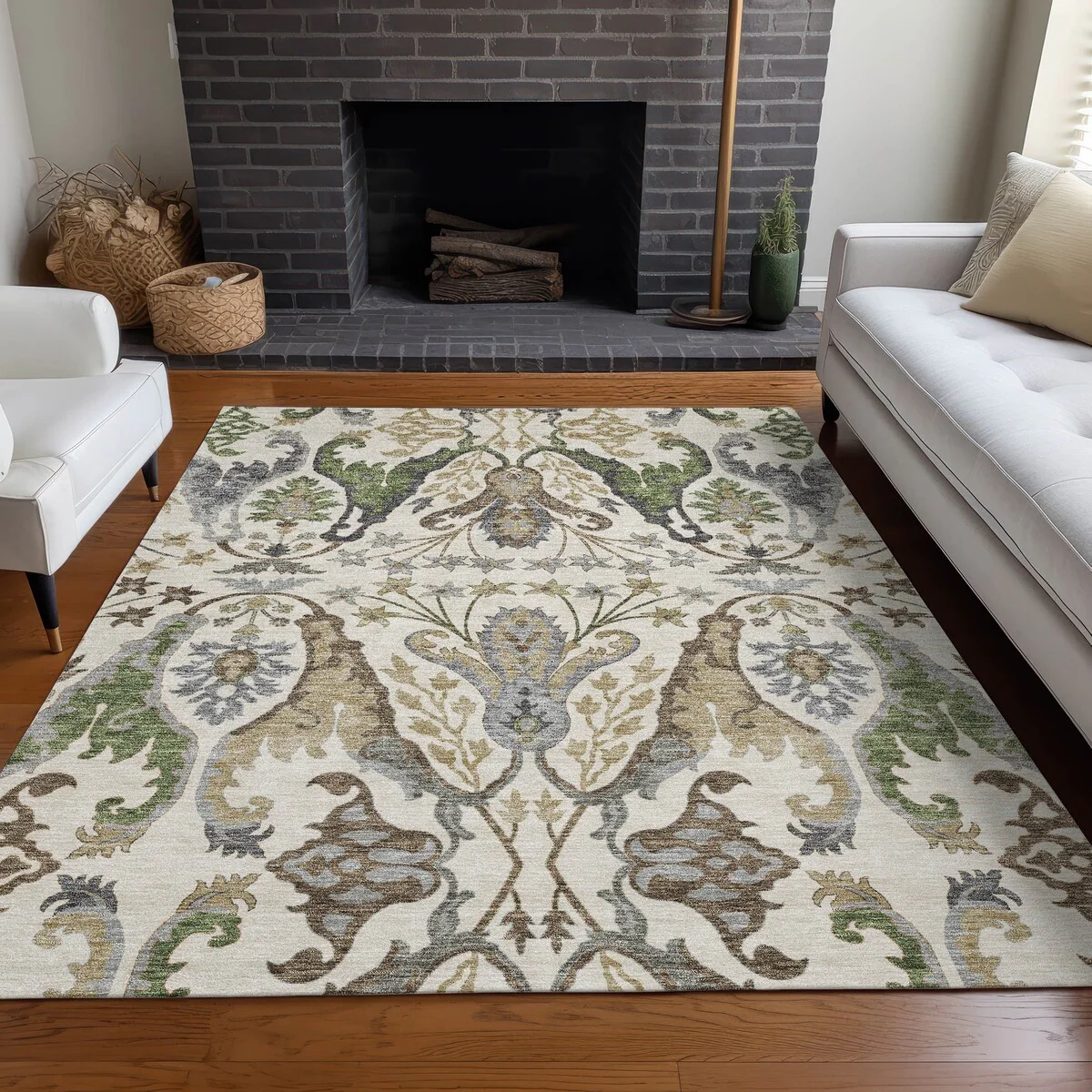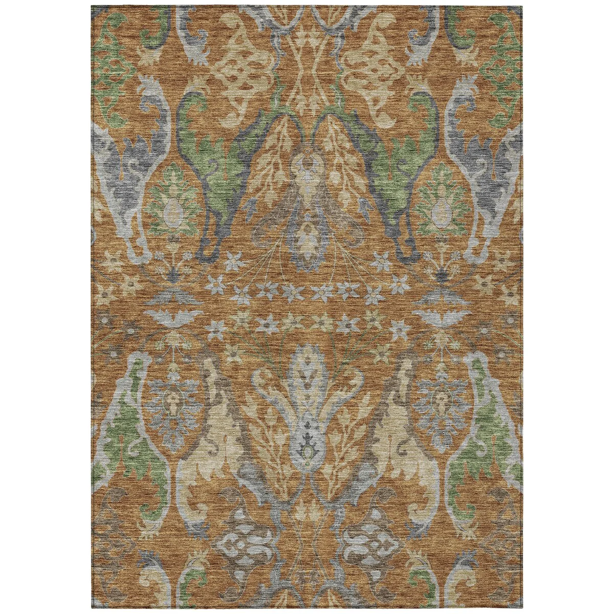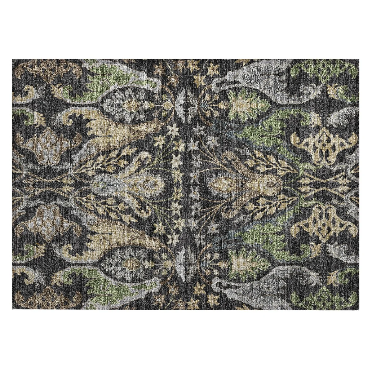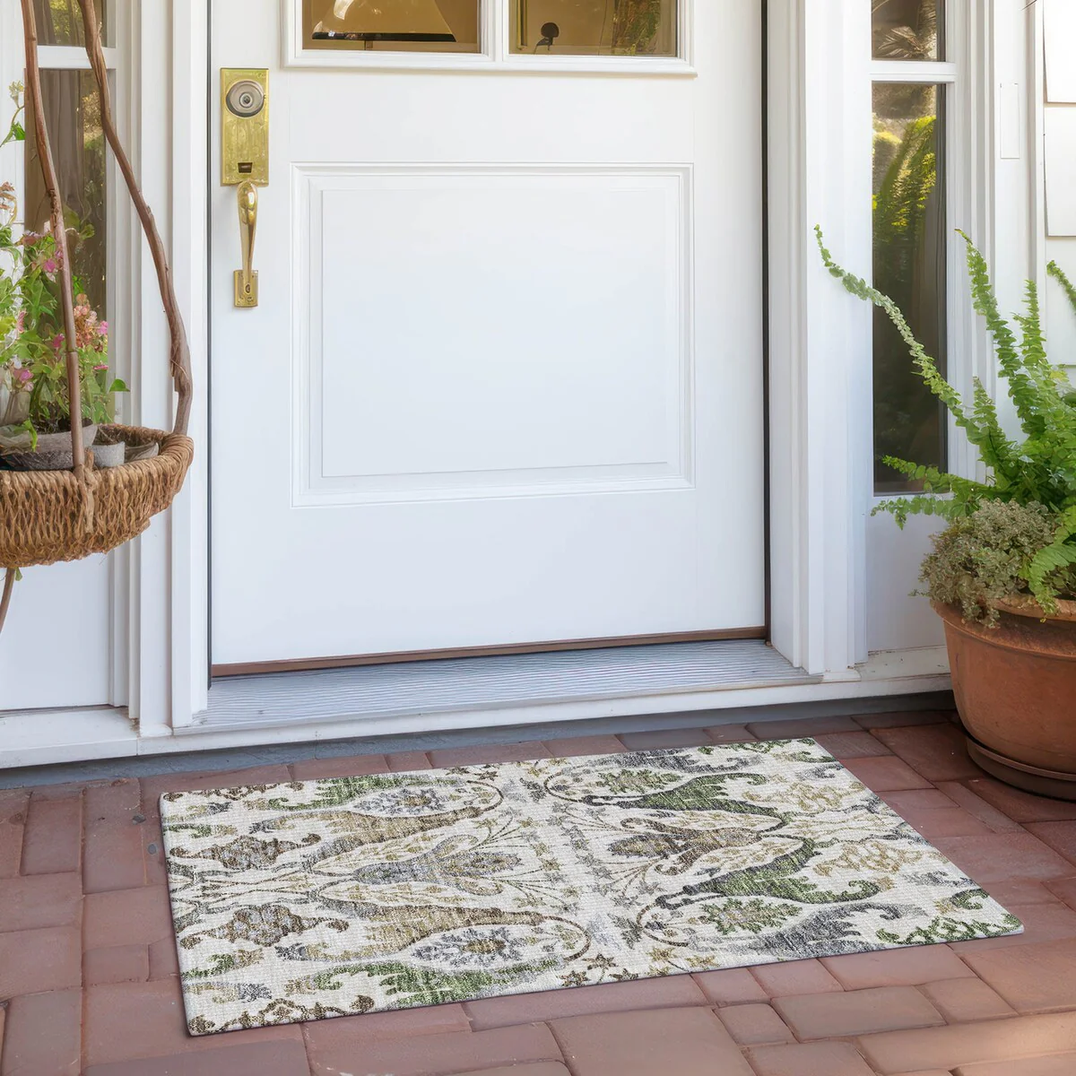 Add sophistication to your home with our area rug, featuring a beautifully detailed mirrored pattern that has an earthy vibe and seamlessly integrates transitional and global design elements. UV stabilized for lasting color, it's perfect for indoor or outdoor use. The ultra-thin construction ensures easy placement, and its machine-washable nature makes it a practical choice for families and pet owners. All rugs exposed to long periods of intense and direct sunlight can experience loss of color over time. Our rugs perform best in covered outdoor areas and uncovered areas with lower hours of direct sunlight. The ultra thin profile allows for fast drying after rainfall or outdoor cleaning. Larger rug sizes may not fit into a residential washing machine. They may be washed in a commercial size washing machine or hosed-off outside with mild soap and water. Air-dry, do not machine dry. While each rug already has a non-skid backing, the necessity for additional cushion or room settings with high traction areas, may require an additional rug pad.