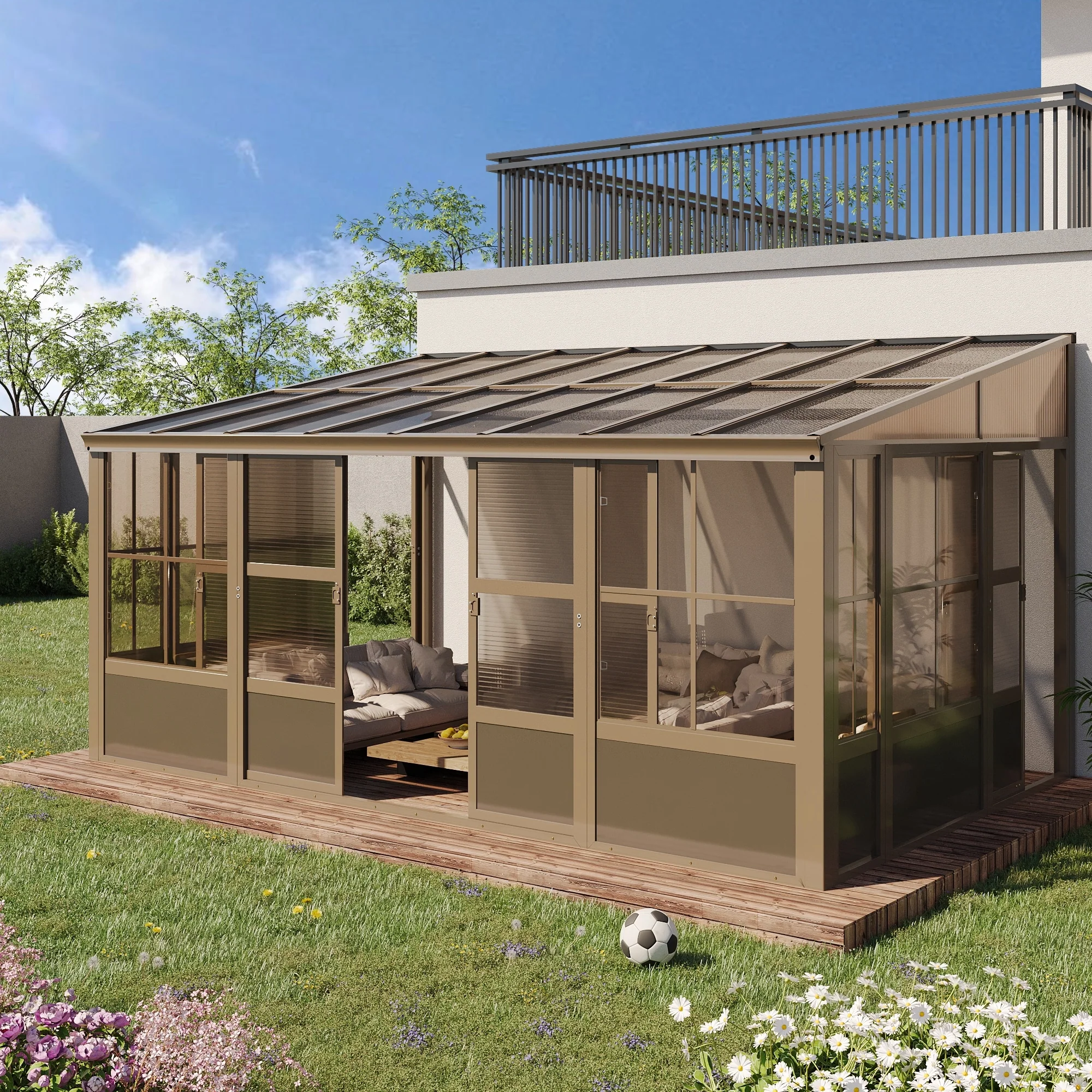 • Erommy Wall Mounted Sunroom with Sliding Doors, All-Season Aluminum Patio Gazebo, Outdoor Permanent Sunroom Shelter