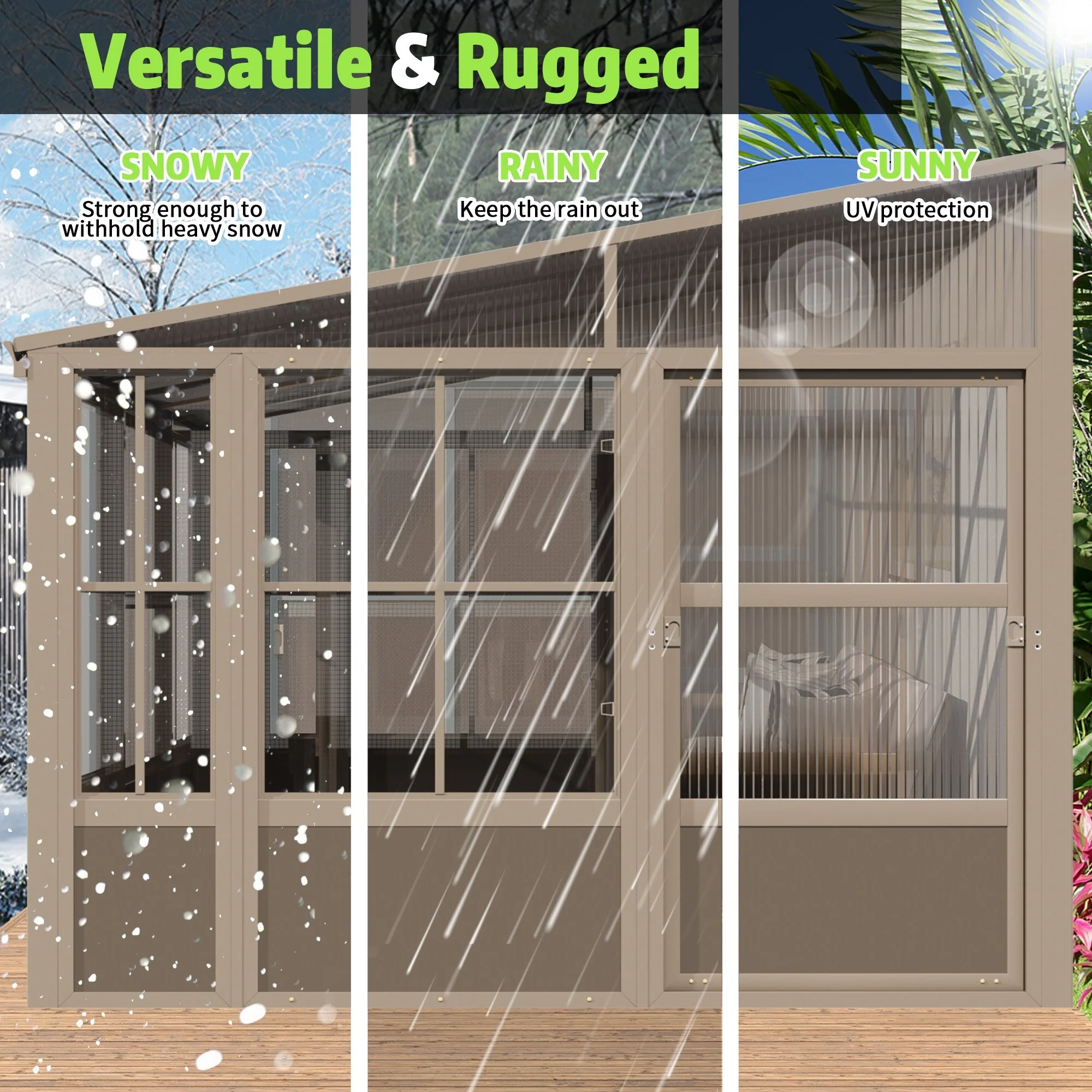 • ��Heavy-Duty Aluminum Frame with Rust Protection�� ??Built with a powder-coated aluminum frame, this outdoor sunroom resists corrosion and rust, ensuring a long service life with minimal maintenance. The reinforced structure delivers superior stability, making it a reliable upgrade from temporary gazebos.